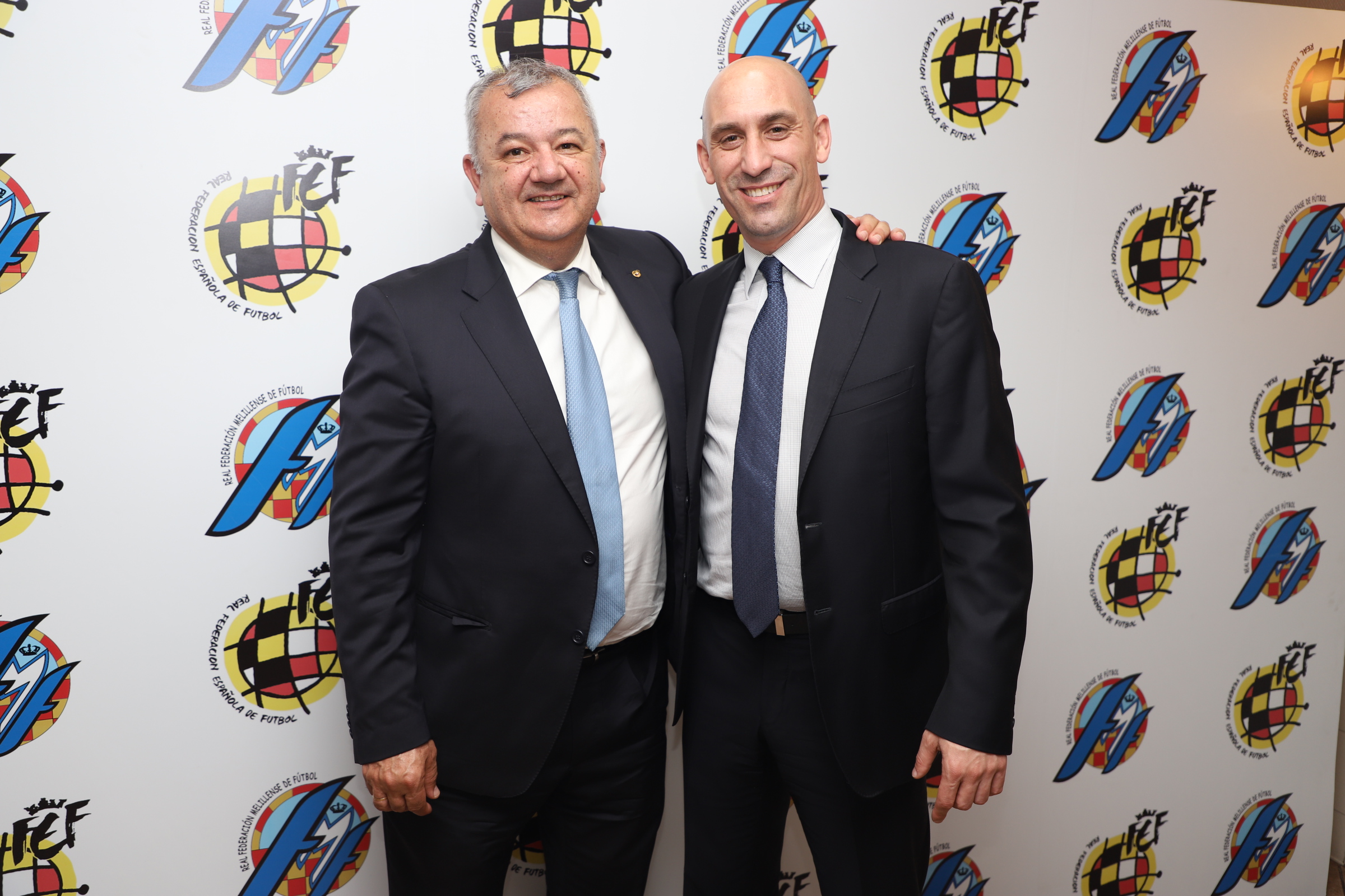 El presidente del fútbol melillense, Diego Martínez (d), junto al máximo responsable de la RFEF, Luis Rubiales.