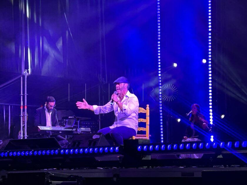 No estaba solo en este viaje. Un grupo de músicos de gran calidad lo arropó con un sonido impecable, tejiendo un acompañamiento que iba de la delicadeza al desgarro con maestría. A su lado, las guitarras flamencas pusieron la hondura, el cajón marcó el compás con precisión y las palmas completaron el aire festivo.