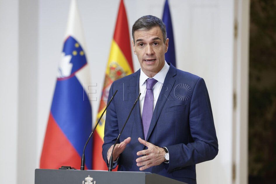 El presidente del Gobierno español, Pedro Sánchez durante la rueda de prensa tras su encuentro con el primer ministro de Eslovenia, Robert Golob en el Palacio de la Moncloa, este jueves. Ambos mandatarios ratificarán este jueves en Madrid. EFE