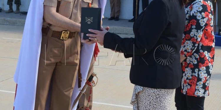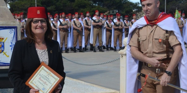 Posteriormente, se llevó a cabo el nombramiento de Regulares de Honor, que en esta ocasión, recayó en la Delegación de la Compañía Trasmediterránea en Melilla y en su Delegada, Pilar Rodríguez-Guerra Mozo, como muestra de agradecimiento al permanente apoyo, afecto, cariño y desinteresada colaboración demostrados hacia las Fuerzas Regulares, tanto por dicha delegación como, muy especialmente, por la Sra. Rodríguez-Guerra, ejemplo de virtudes profesionales y humanas para todos los que la conocen.