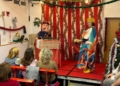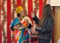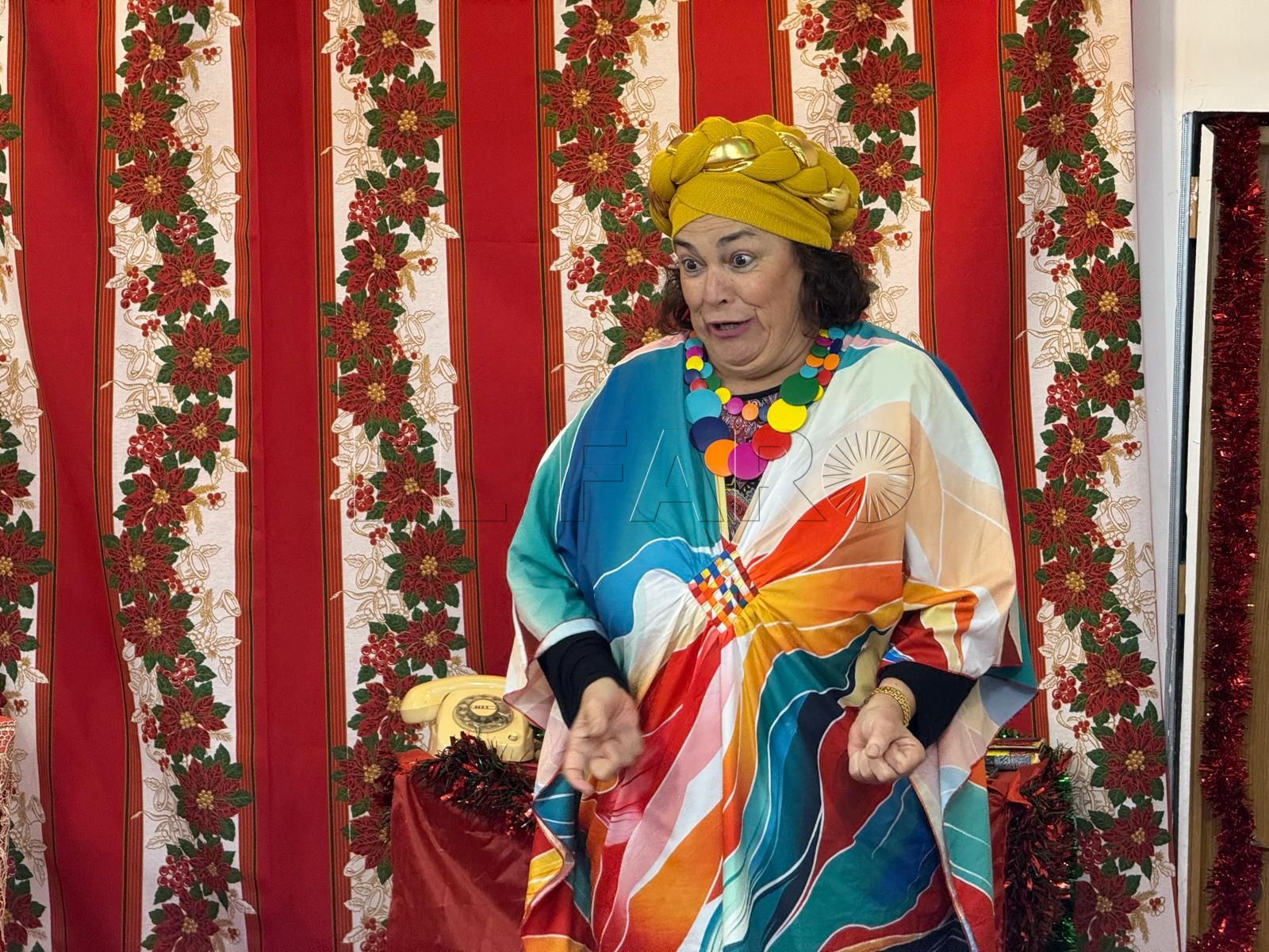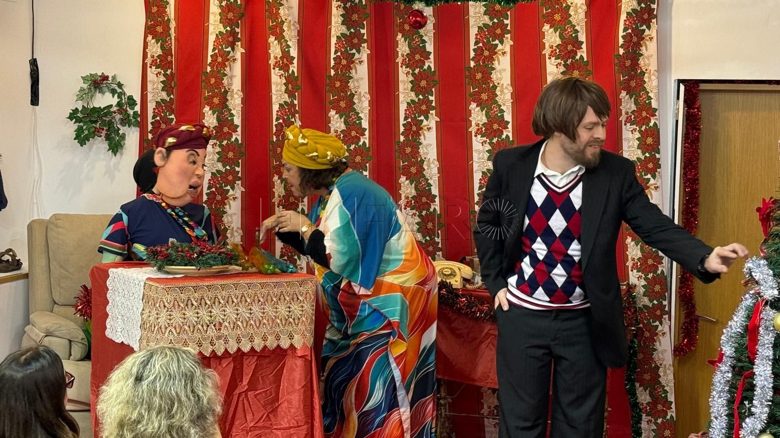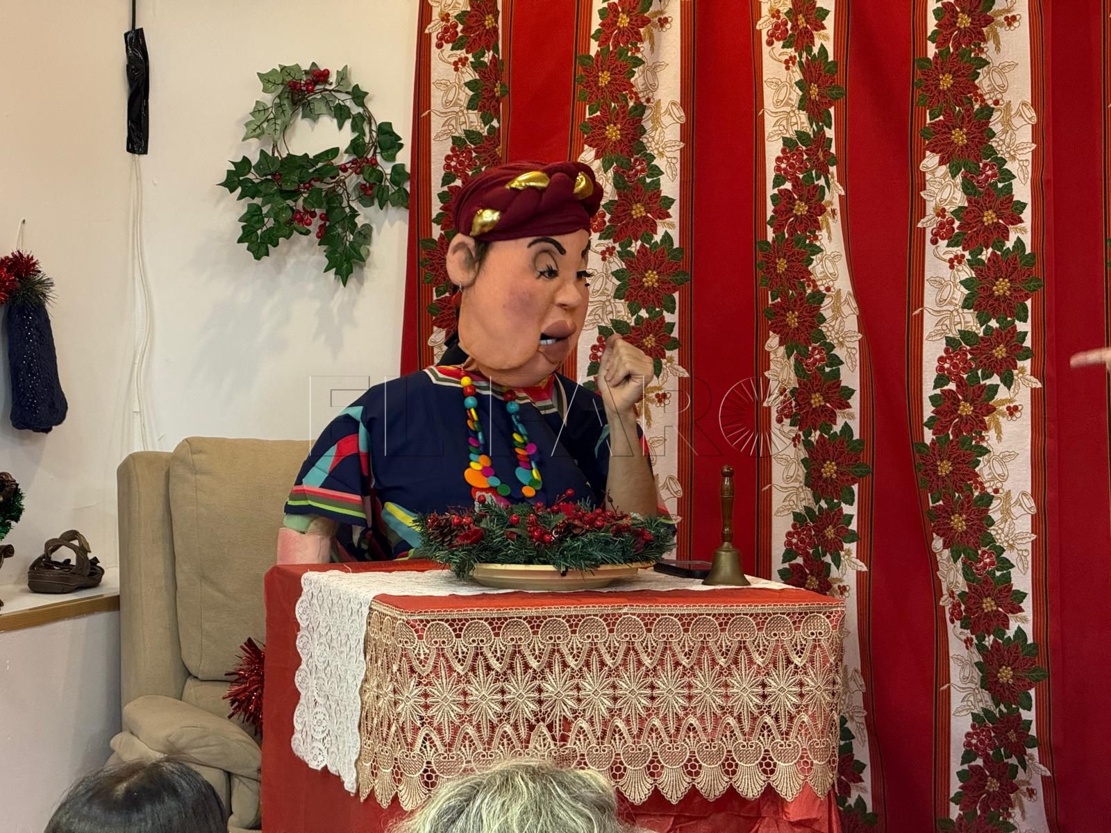 La otra hermana, Dora, interpretada por Mar Vidal, se mueve con una libertad expresiva que marca buena parte del tono de la obra. Vidal no se contiene: gesticula, improvisa, se amolda al ritmo de sus compañeros e interactúa con el público hasta el punto de hacerles partícipes de una misteriosa “tarea especial” que solo ocurre una vez al año. Su energía arrolladora arrastra al espectador a un estado constante de carcajada, especialmente cuando comienza el intercambio de pullas, recuerdos y descripciones de sus nuevos amores con su hermana marioneta, en una relación tan realista como desternillante.