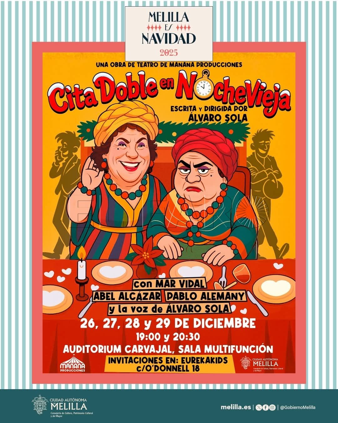 En plena programación navideña de Melilla, el teatro se viste de humor, marionetas y guiños locales con la obra “Cita doble en Nochevieja”, escrita y dirigida por Álvaro Sola, que se representa del 26 al 29 de diciembre en doble pase, a las 19:00 y 20:30 horas, en el Auditorium Carvajal. La historia arranca con dos hermanas mayores, Leonor y Dora, que deciden celebrar la Nochevieja de forma especial: invitando a casa a los hombres con los que mantienen una suerte de romance tardío. Lo que prometía ser una velada íntima y festiva se convierte en una sucesión de situaciones disparatadas, cotilleos del rellano que el público corea al grito de “¡coti, coti…!”, llamadas insistentes de una vecina obsesionada con las campanadas y un ambiente que se va desbordando entre carcajadas, canciones reconocibles que invitan a alzar la voz desde el asiento y participación activa del público.