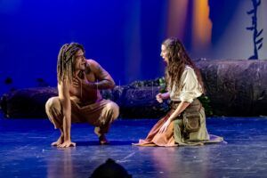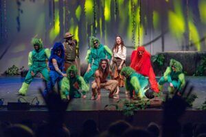 Desde el primer minuto, “Tarzán, el hijo de la jungla” sumerge al espectador en un universo selvático cuidadosamente recreado. Escenografía, iluminación y vestuario colaboran para transportar al público al corazón de África, en un montaje que prioriza la estética, la emoción y el simbolismo por encima de la literalidad.