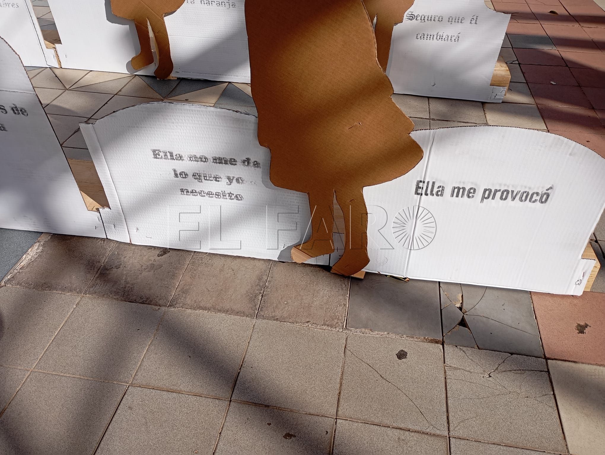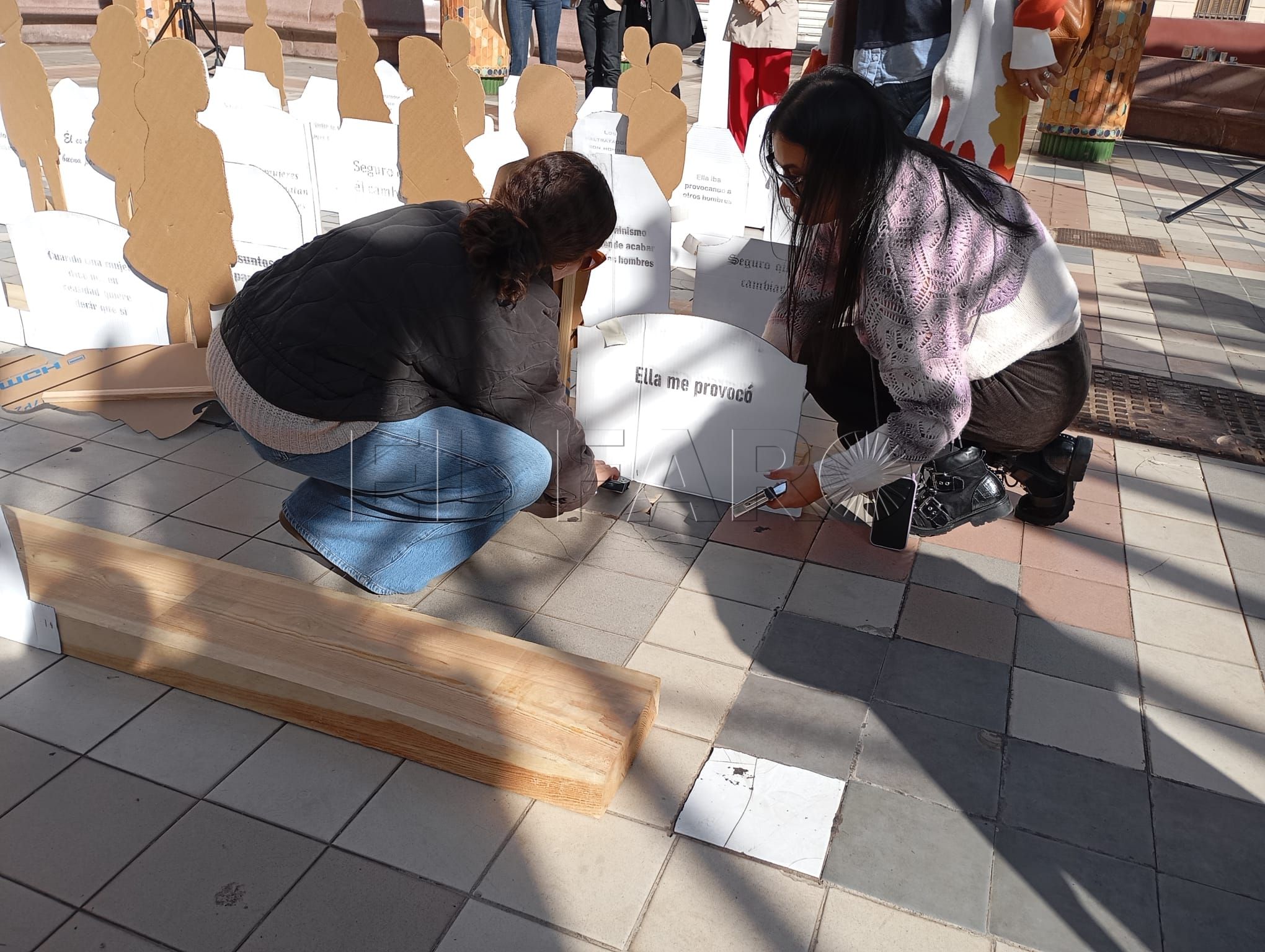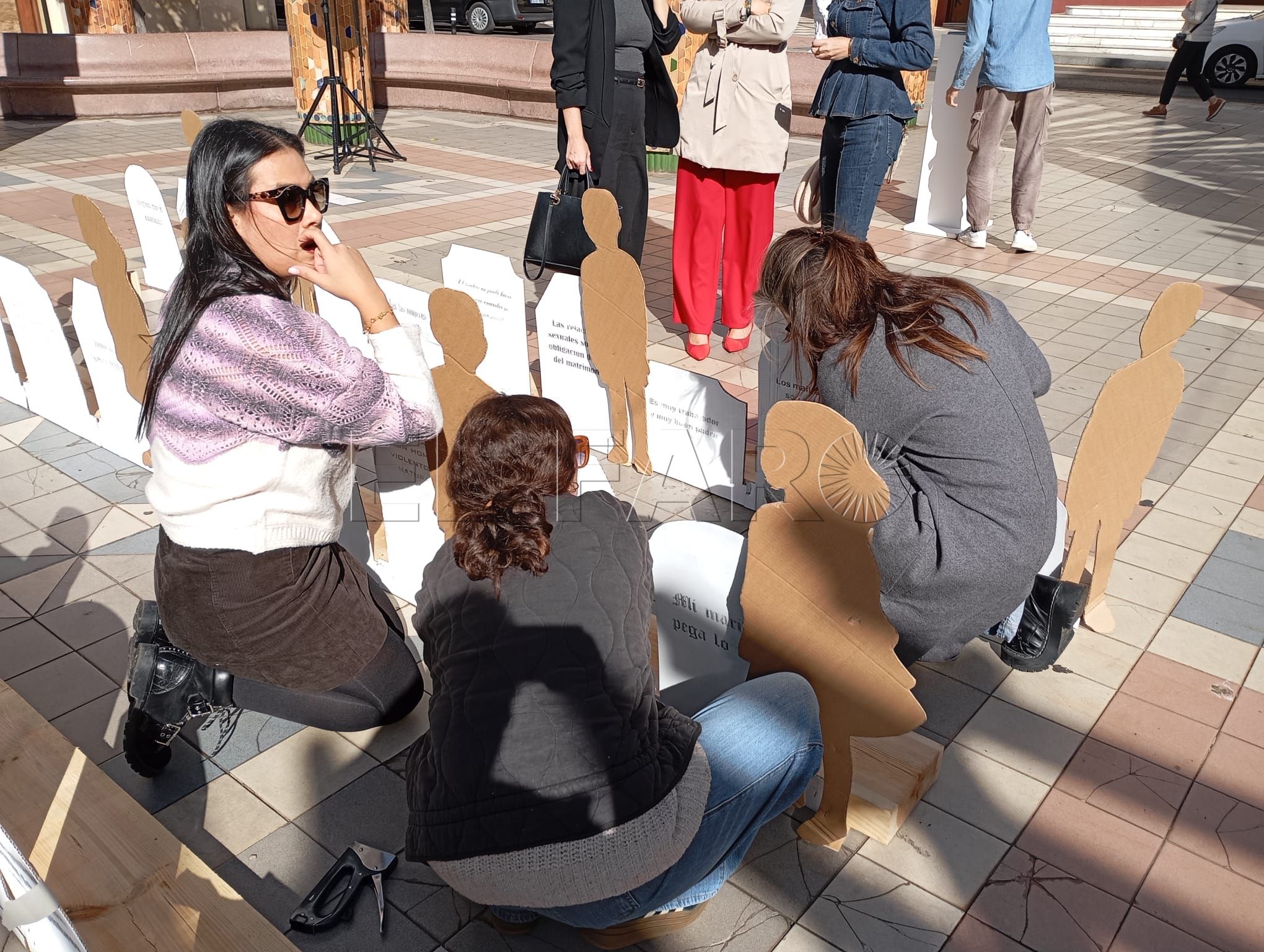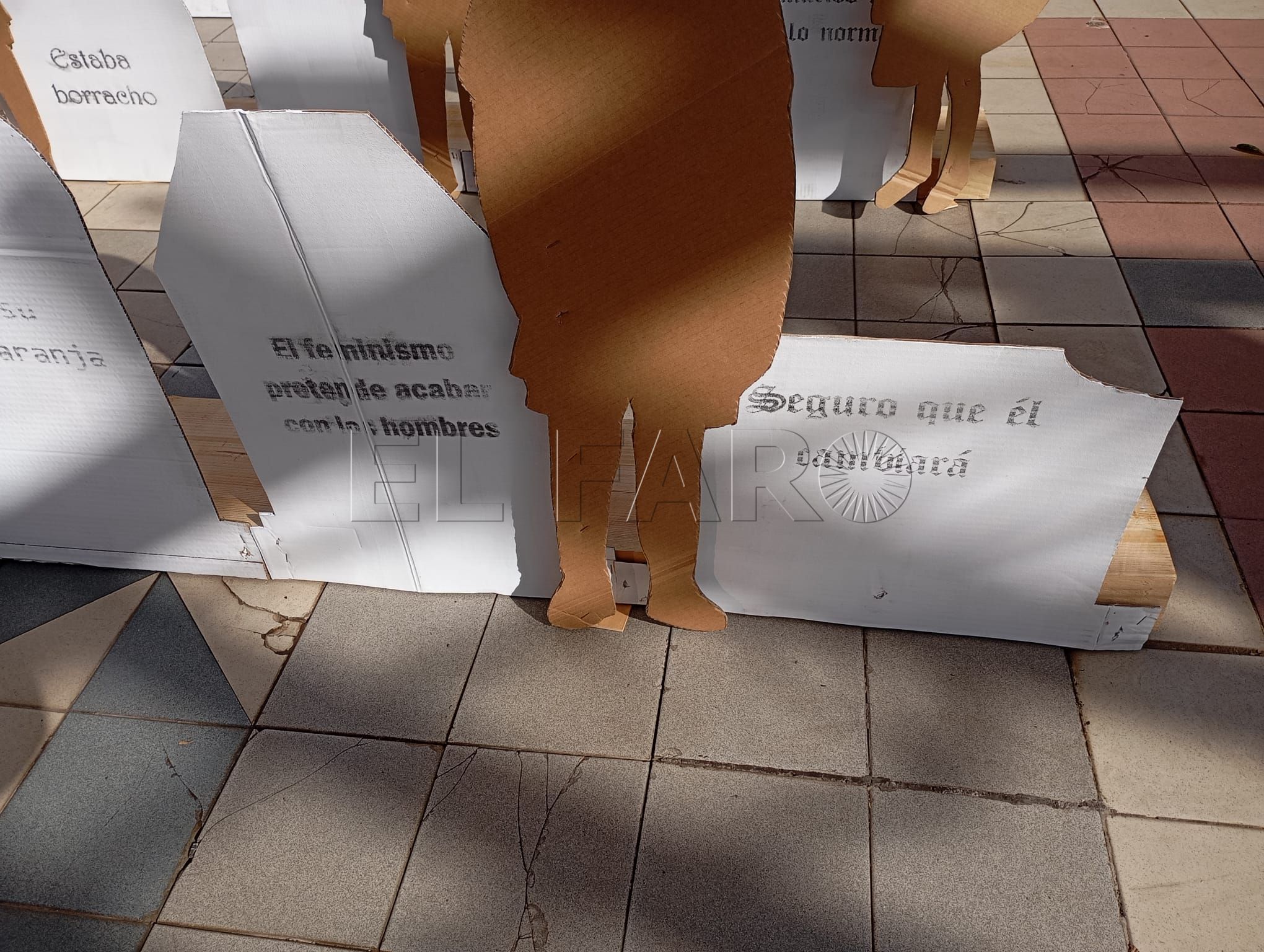 El acto ha contado con representaciones de figuras en relieve que han llenado la plaza, sobre las cuales podían leerse frases en las que se escudan los comportamientos machistas y la justificación de las violencias contra las mujeres y los niños.