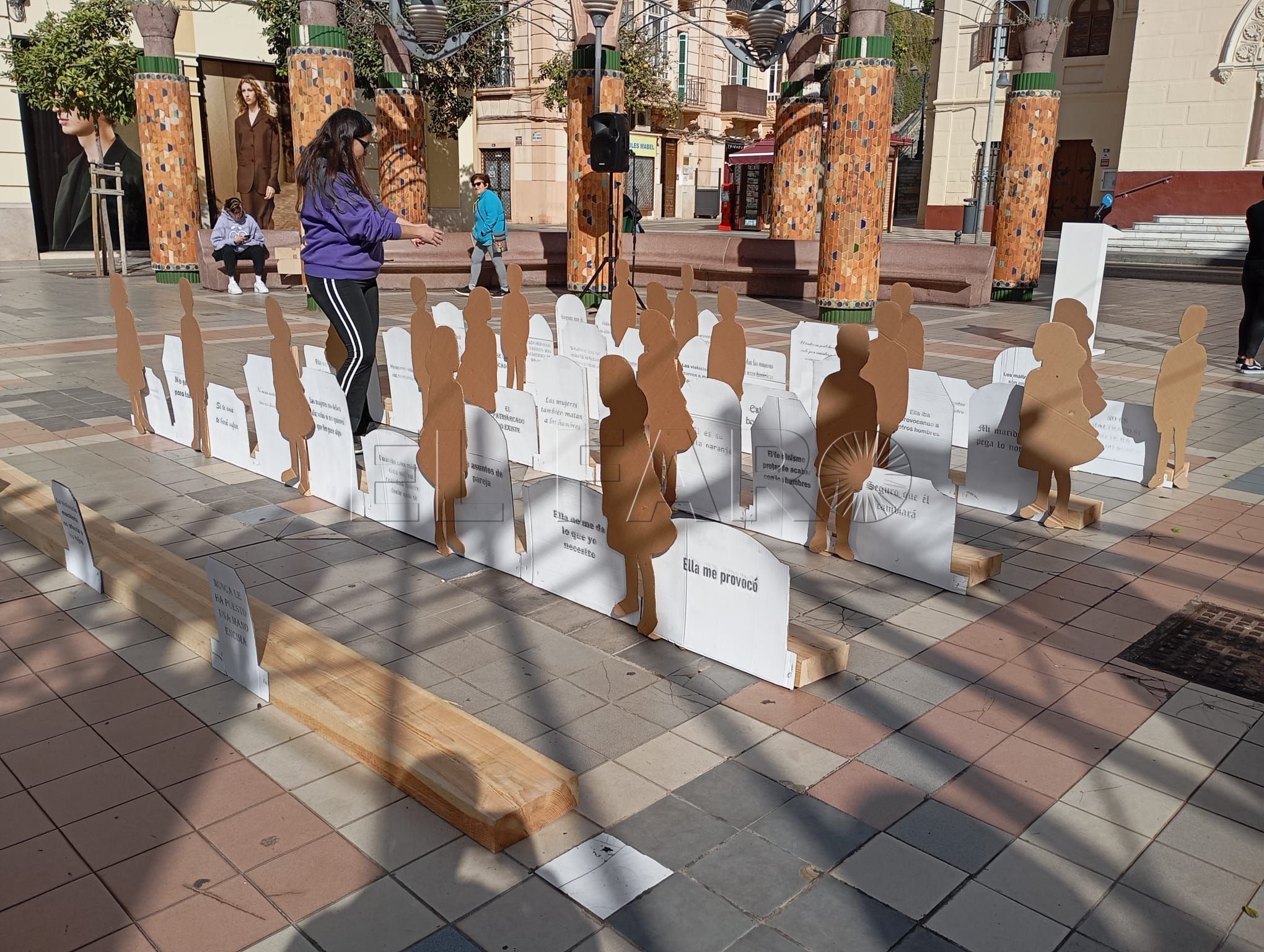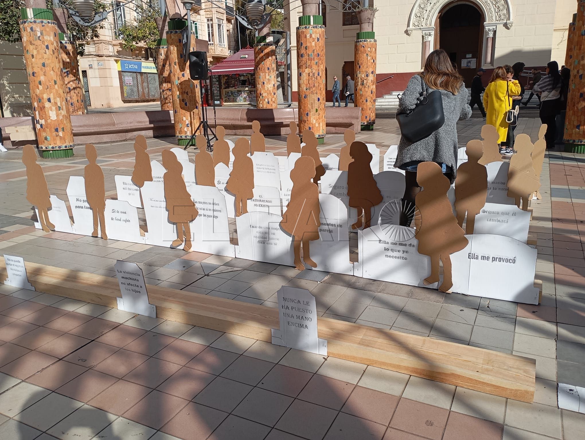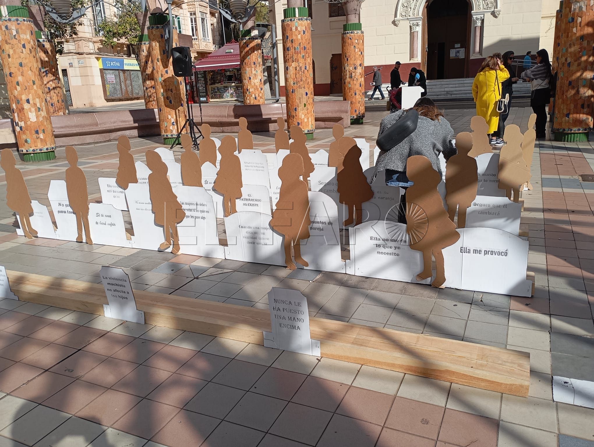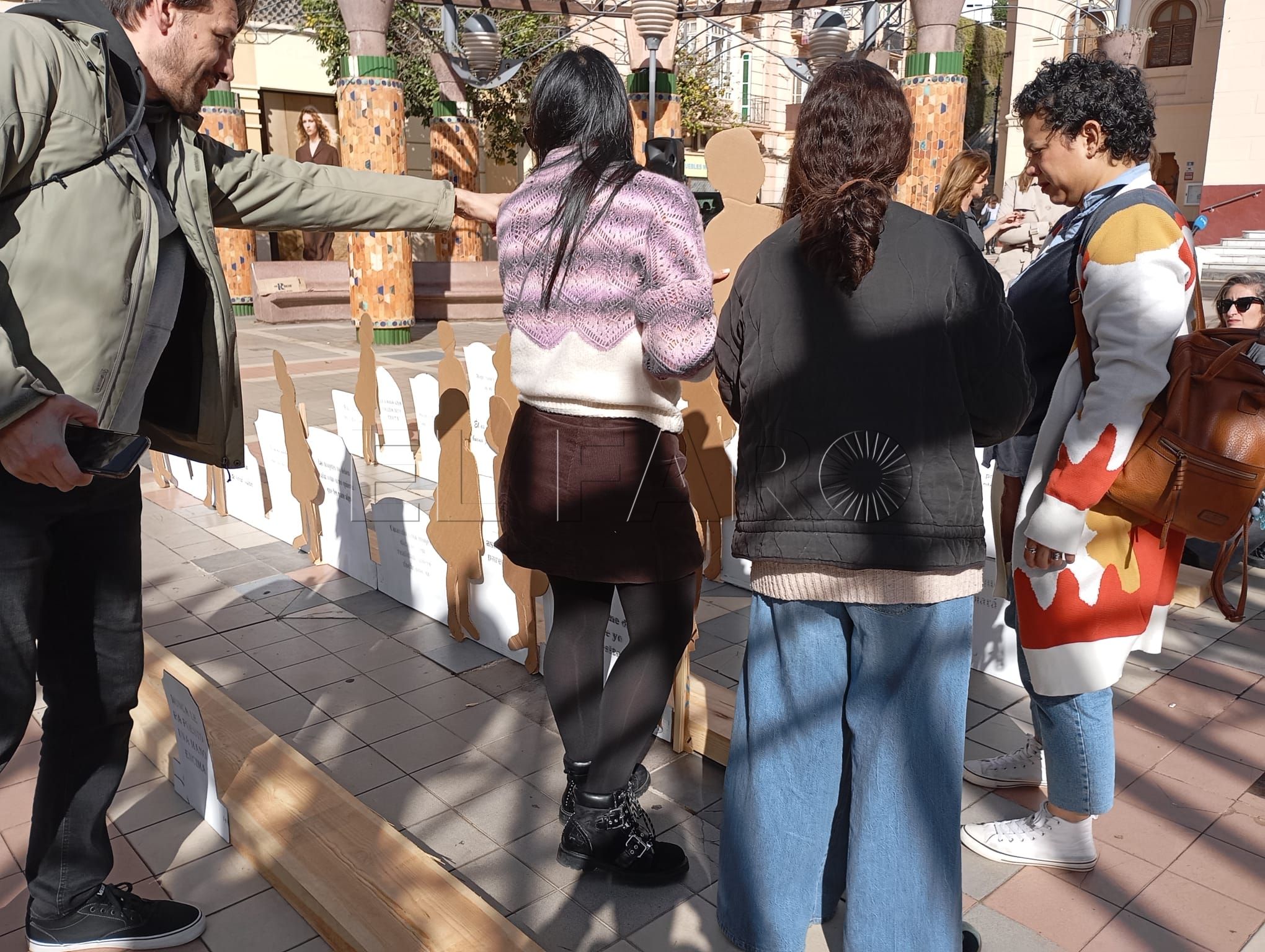 El acto ha contado con representaciones de figuras en relieve que han llenado la plaza, sobre las cuales podían leerse frases en las que se escudan los comportamientos machistas y la justificación de las violencias contra las mujeres y los niños.