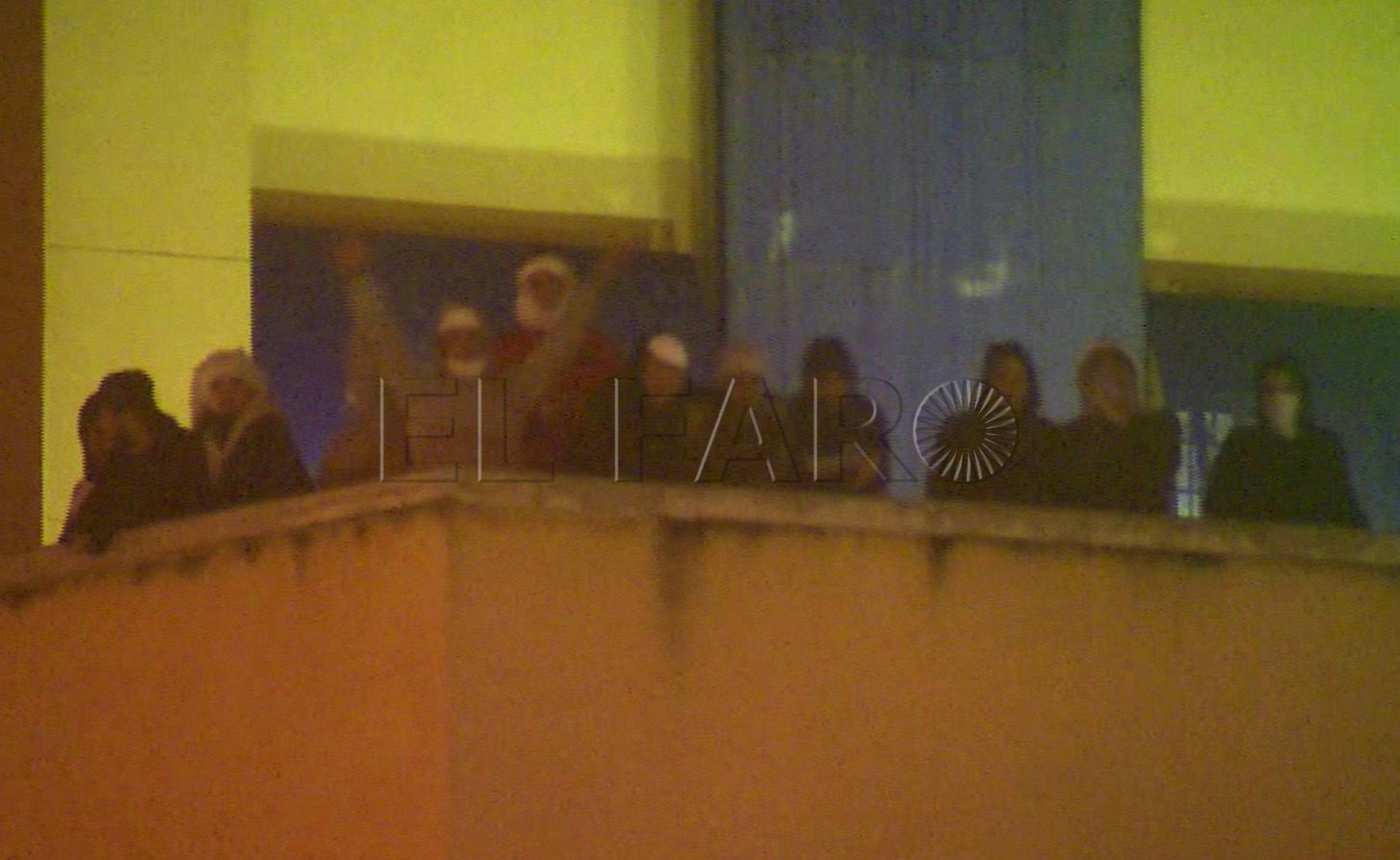 GRA001. MADRID, 19/10/2016.- Fotografía capturada de imágenes de EFE TV. Unos 30 inmigrantes continúan en la azotea del Centro de Internamiento de Extranjeros (CIE) de Aluche más de once horas después de iniciar un motín en el edificio, situado en la madrileña avenida de los Poblados, mientras que la Policía Nacional ha intentado negociar sin éxito con los internos. Los internos permanecen recluidos en la terraza de la parte superior del CIE, aunque solo unos pocos son visibles desde la calle, y algunos portan palos y pancartas hechas en tela en las que se puede leer "libertad". El motín, en el que participaron medio centenar de personas, se inició sobre las 21.15 horas cuando los internos subieron a la parte más alta del centro y comenzaron a arrojar piedras y mobiliario a la vía pública aunque, de momento, se desconoce con exactitud su reivindicación. EFE/EFE-TV