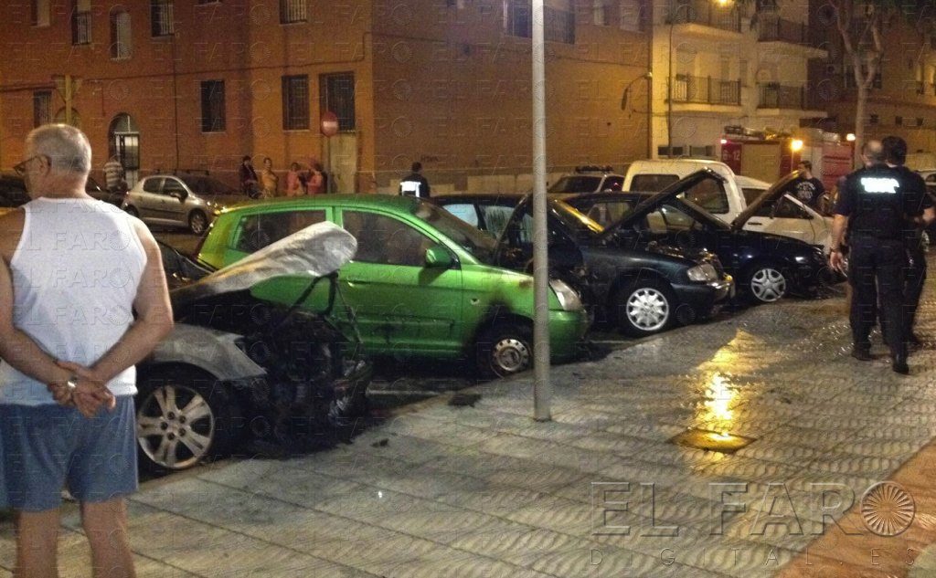 El fuego sobresaltó a los vecinos de El Real en la madrugada del martes al miércoles. Pasadas las 2:30 de la madrugada seis vehículos comenzaban a arder en la calle Bocana, justo al lado del nuevo parque de las Conchas. El fuego, que al parecer se inició de forma intencionada, comenzó en uno de los coches. De hecho, según informaron ayer los Bomberos de la ciudad, la primera llamada que recibieron venía de un vecino que les explicó que había un vehículo ardiendo en la calle. Sin embargo cuando los efectivos ya estaban de camino recibieron nuevos avisos, que les indicaron que las llamas se habían propagada y afectaban hasta a seis coches. Decenas de vecinos de la zona, entre ellos algunos de los propietarios de los coches afectados, salieron a la calle a contemplar la desoladora imagen. La mayoría de los vehículos quedaron prácticamente inservibles y según explicaron los agentes del Cuerpo de Bomberos, las llamas afectaron principalmente a los motores y la parte delantera de los turismos que ‘dormían’7 en la calle. Hasta el lugar de los hechos se trasladaron además de dos vehículos de Bomberos, con ocho agentes en total, efectivos de la Policía Nacional y de la Policía Local que sirvieron de apoyo a sus compañeros. Los vecinos de la zona apenas podían creer lo que estaba sucediendo y algunos de los propietarios de los coches intentaron al menos salvar las pertenencias que tenían en el interior de los coches cuando las llamas se apagaron. Según apuntaron los Bomberos, la intervención duró unos 45 minutos, y en el lugar de los hechos, los agentes encontraron un recipiente con olor a gasolina, que posiblemente fue usado para iniciar el fuego y que es una de las pruebas que analiza la Policía Nacional. La colaboración ciudadana sirvió, además de para que el servicio local de extinción de incendios llegara a tiempo, para poder dar con el supuesto autor de los hechos. Aunque algunos vecinos comentaron que fueron dos los individuos responsables de los hechos, según fuentes de la Delegación del Gobierno, hubo sólo un detenido, un hombre de unos cuarenta años, de nacionalidad marroquí y sin residencia en Melilla. En el momento de la detención, el individuo tenía entre sus pertenencias un mechero y dos botellas en las que había restos de gasolina, mezclada con un líquido acelerador, posiblemente para que el fuego se propagara con mayor rapidez. Los primeros indicios apuntan a que no hubo ninguna motivación para que el detenido prendiera los vehículos, más allá de la el mero hecho de quemarlos. No obstante, los agentes de la Policía Nacional continuaban ayer recavando información e interrogando al sospechoso para aclarar por completo los hechos. Entre los vecinos, que pasaron gran parte de la madrugada en la calle, el miedo y la sorpresa fueron las principales sensaciones. La mayoría de ellos se encontraban en sus viviendas cuando el olor y el humo les alertaó y decidió bajar a la calle para ver lo que estaba sucediendo, al llegar al lugar de los hechos encontraron cómo el fuego estaba afectando a gran parte de los coches estacionados en la calle.