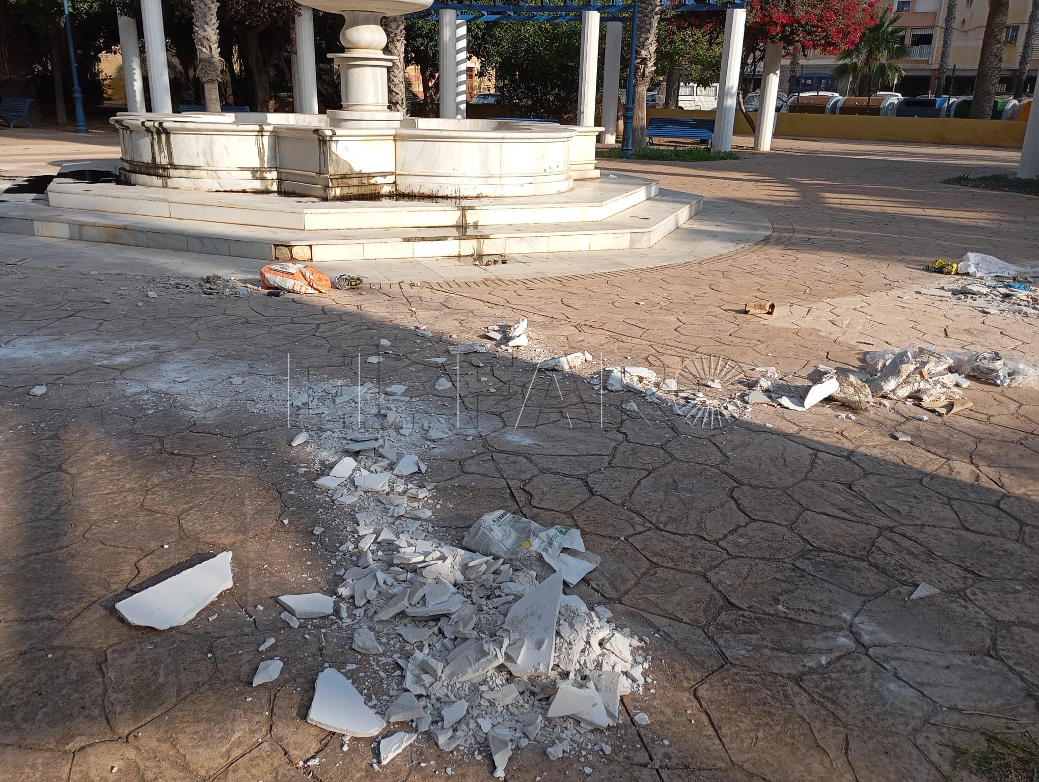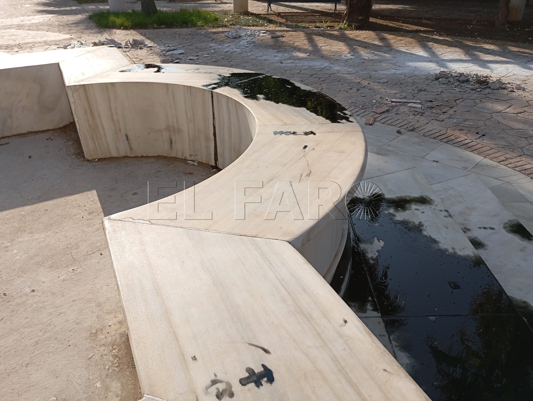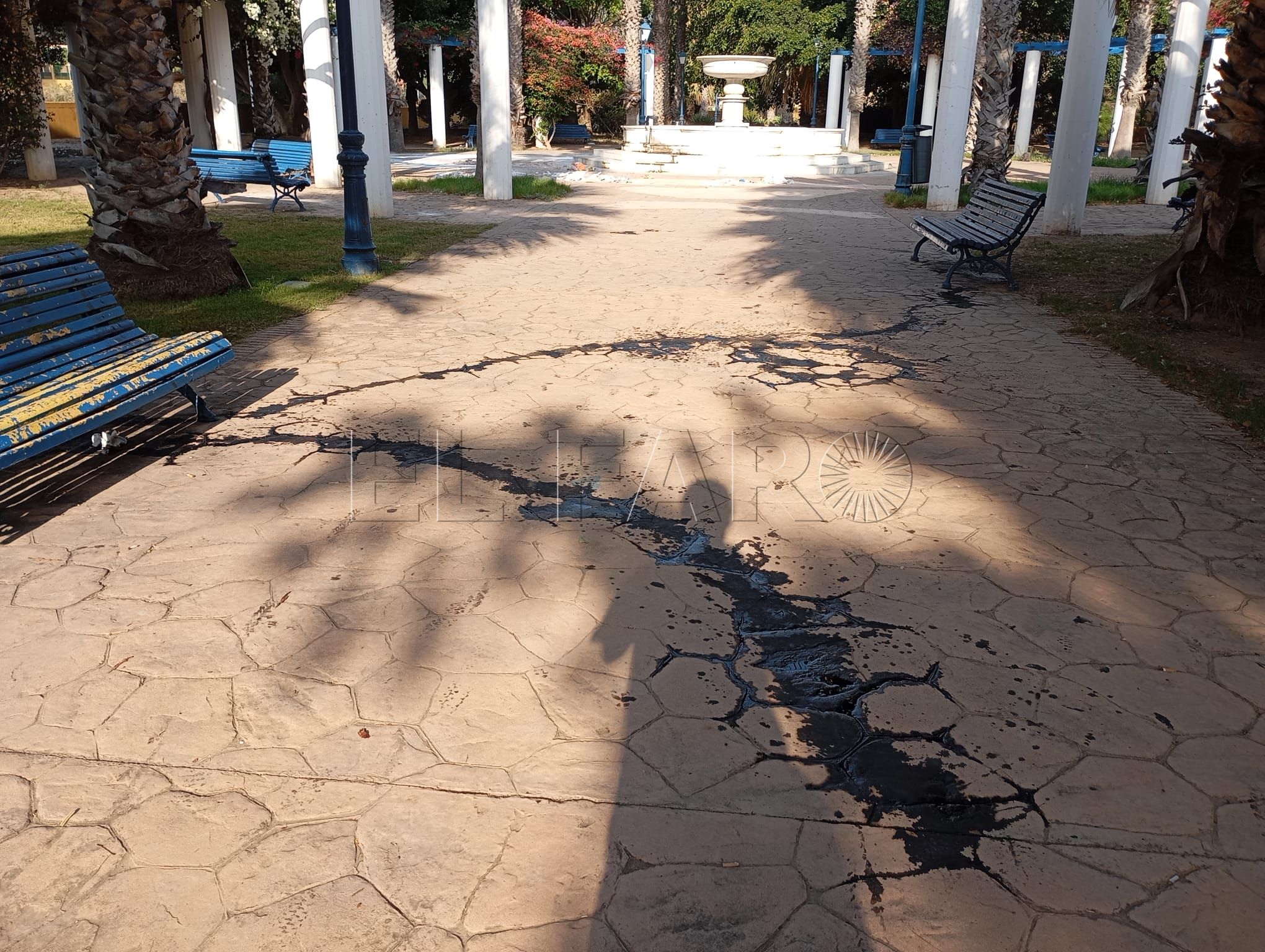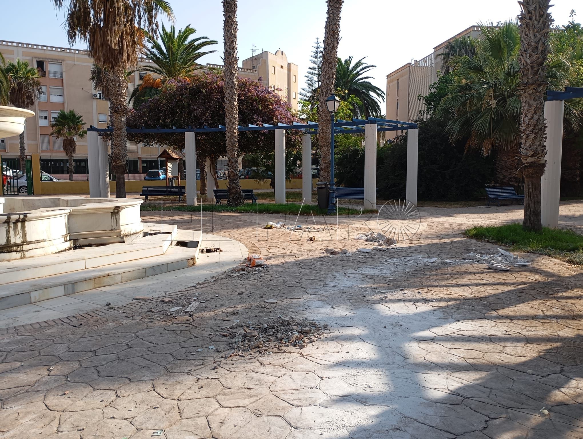 A las 9:30 de la mañana no hay nadie en el parque de Las Palmeras. Por no haber, ni siquiera hay puertas, que han sido arrancadas. Papeleras quedan cada vez menos, ya que dos, al menos, han sido también arrancadas y alguna otra luce desvencijada. Cascotes de piedra tirados, bolsas de material de construcción, aceite por el suelo que llega hasta los bancos e incluso mancha la fuente.