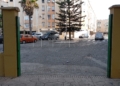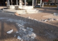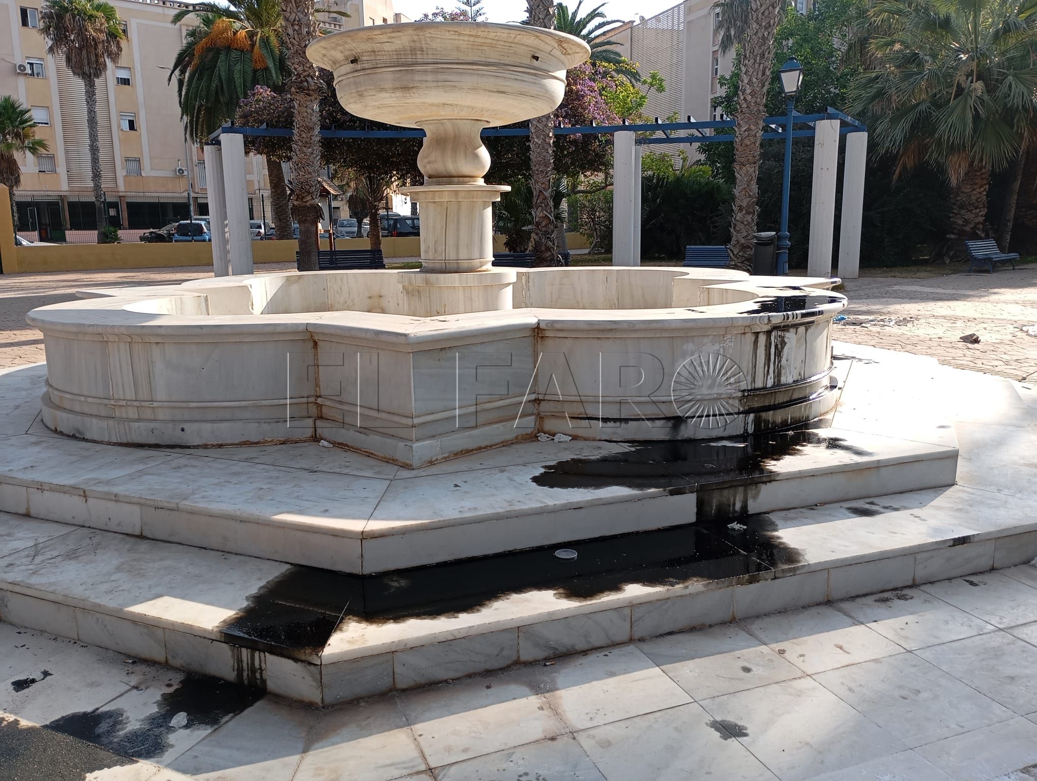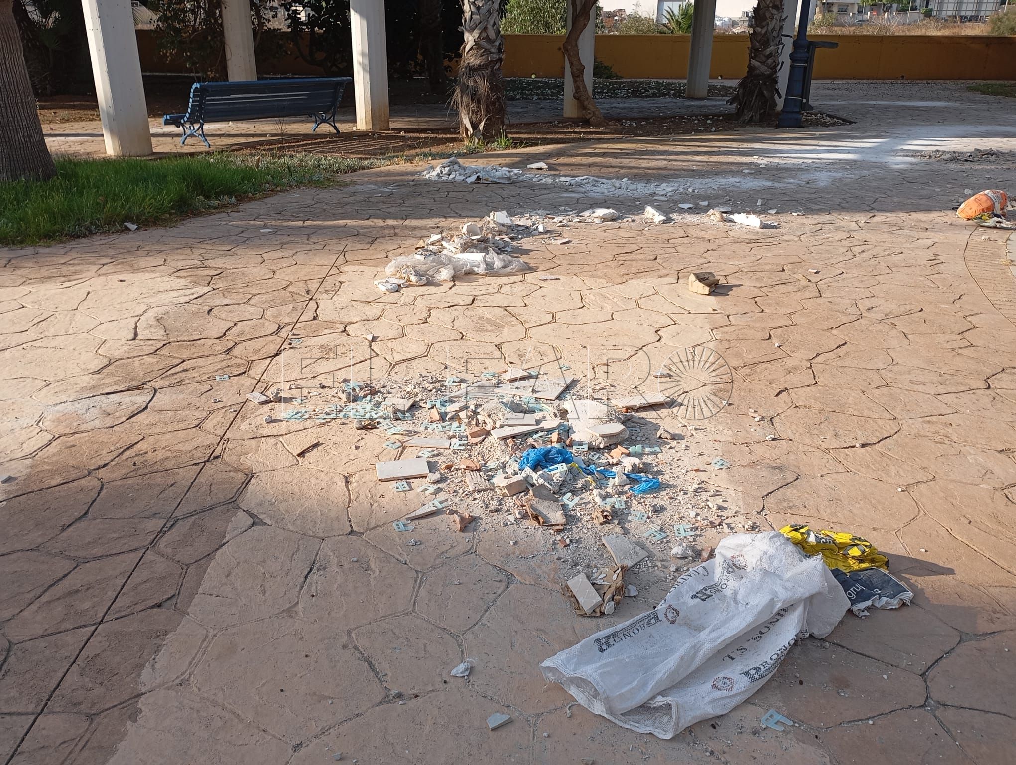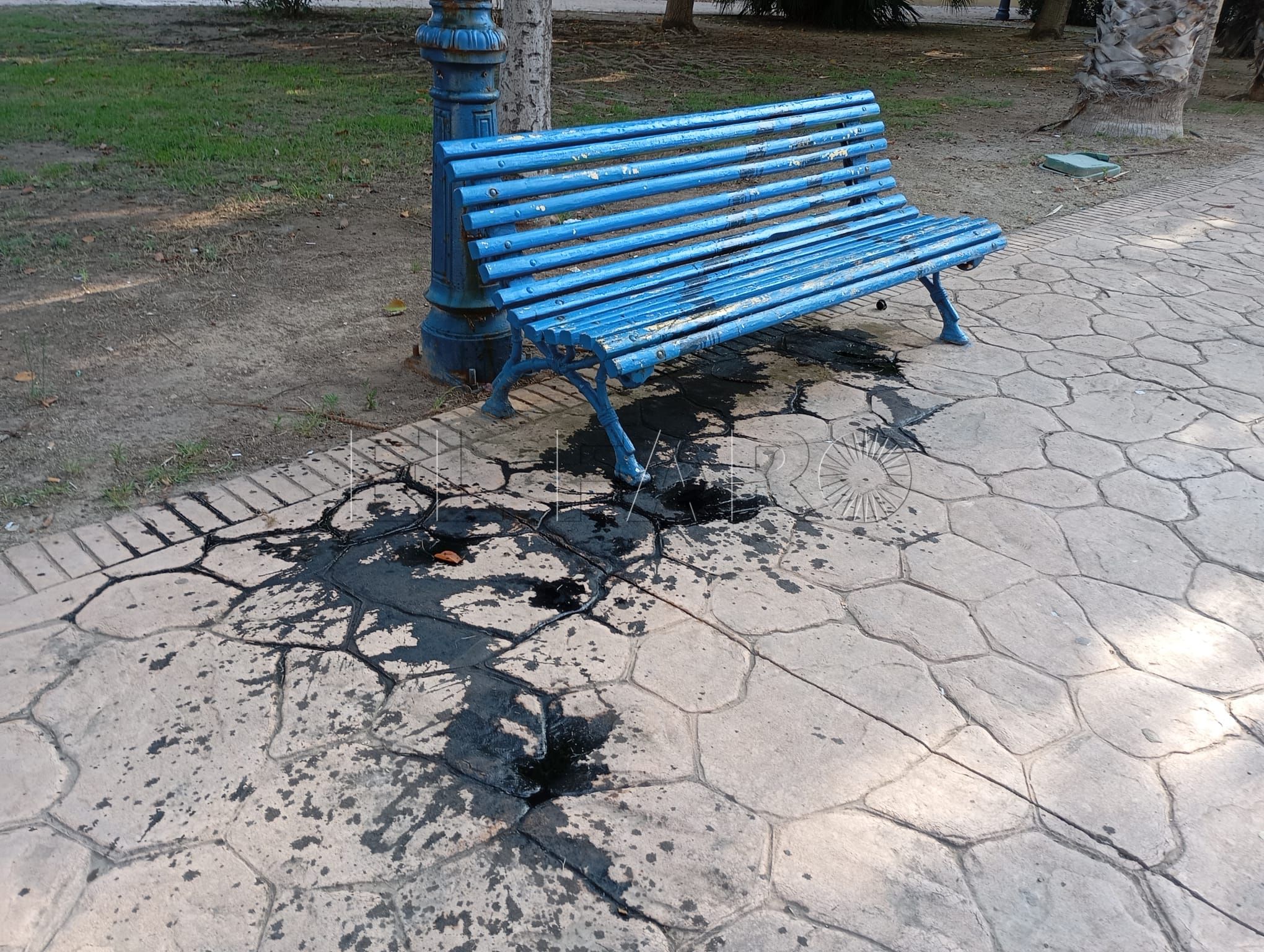 A las 9:30 de la mañana no hay nadie en el parque de Las Palmeras. Por no haber, ni siquiera hay puertas, que han sido arrancadas. Papeleras quedan cada vez menos, ya que dos, al menos, han sido también arrancadas y alguna otra luce desvencijada. Cascotes de piedra tirados, bolsas de material de construcción, aceite por el suelo que llega hasta los bancos e incluso mancha la fuente.