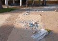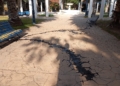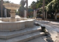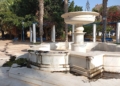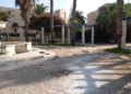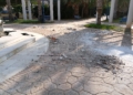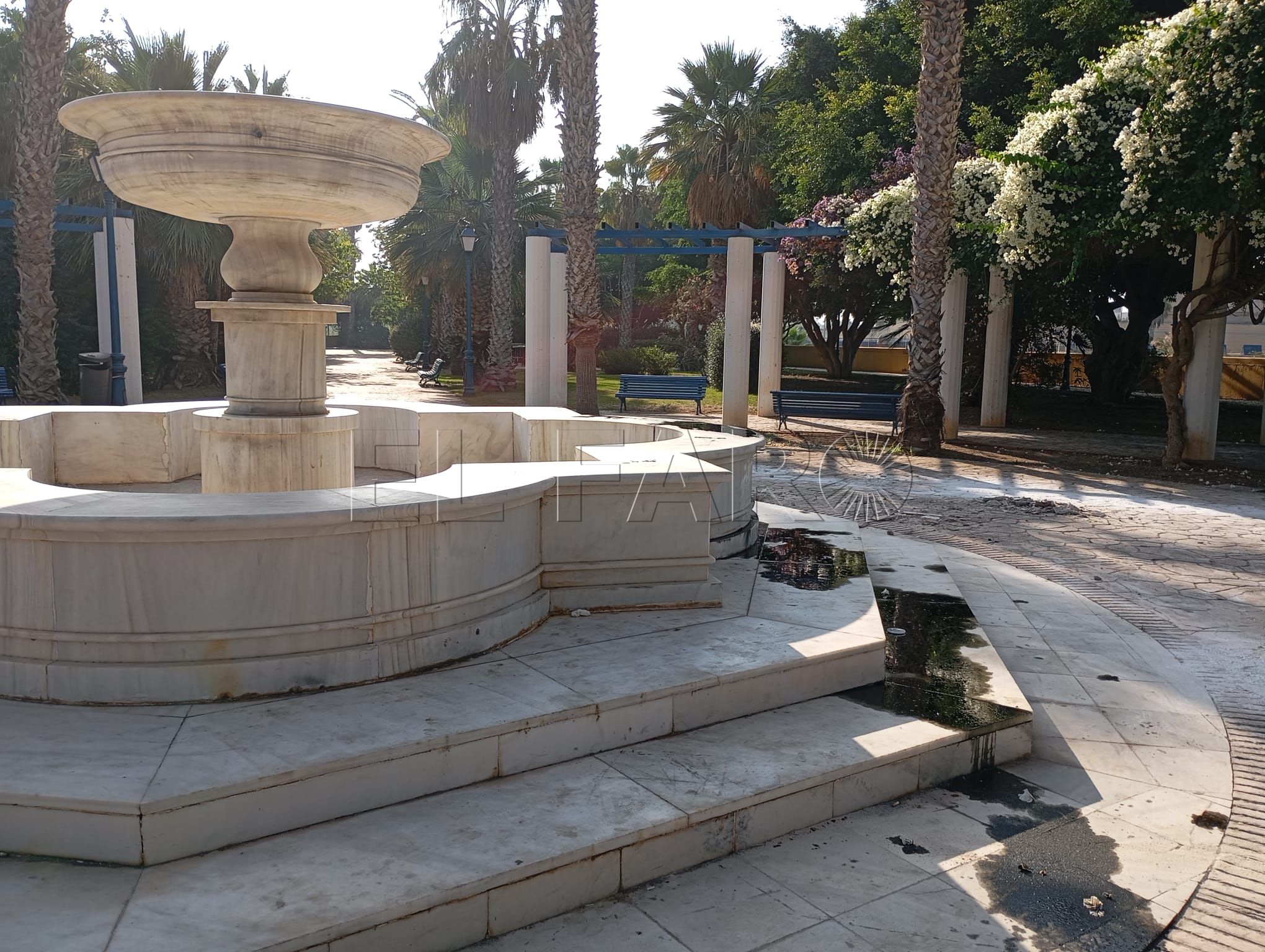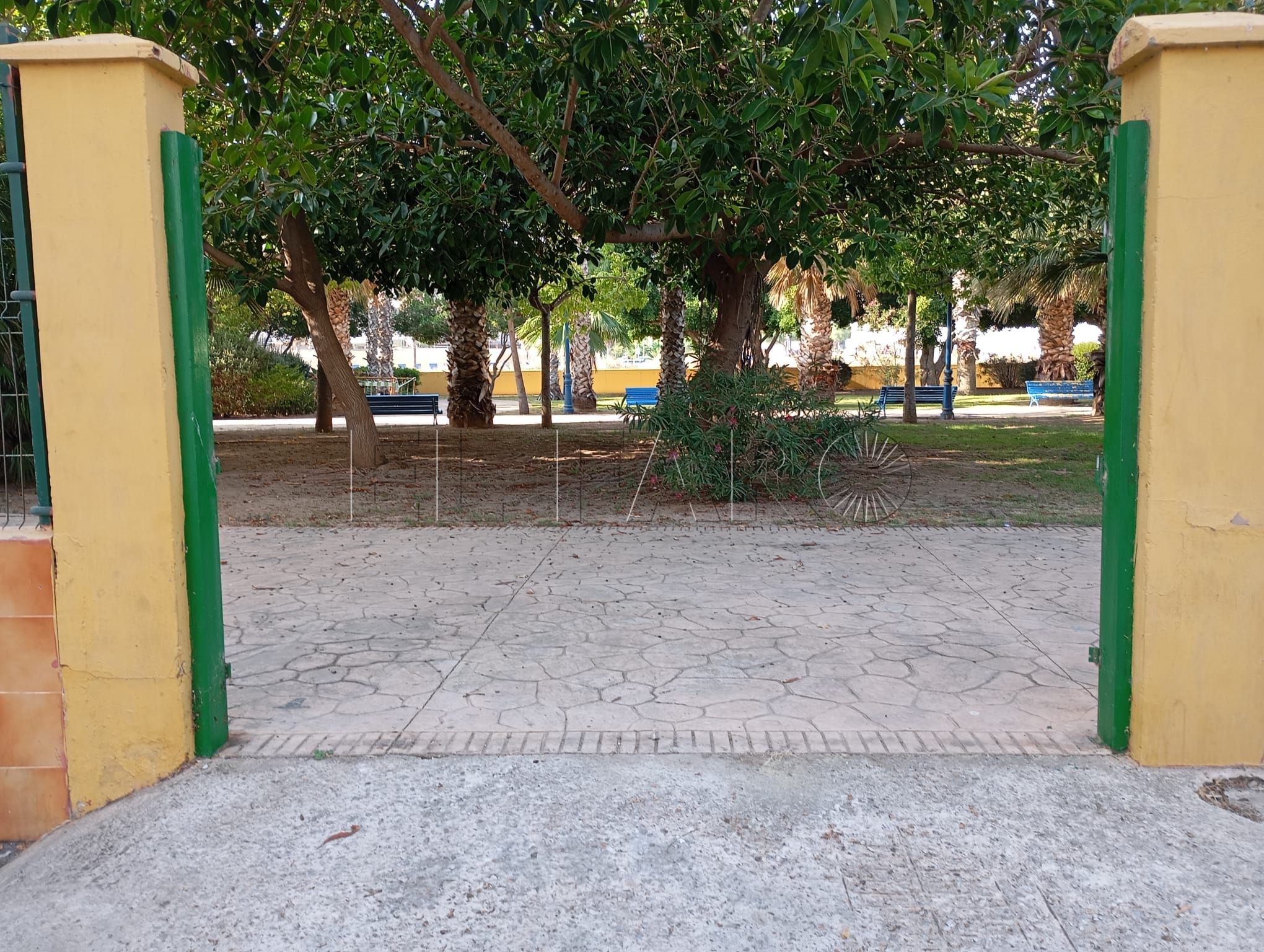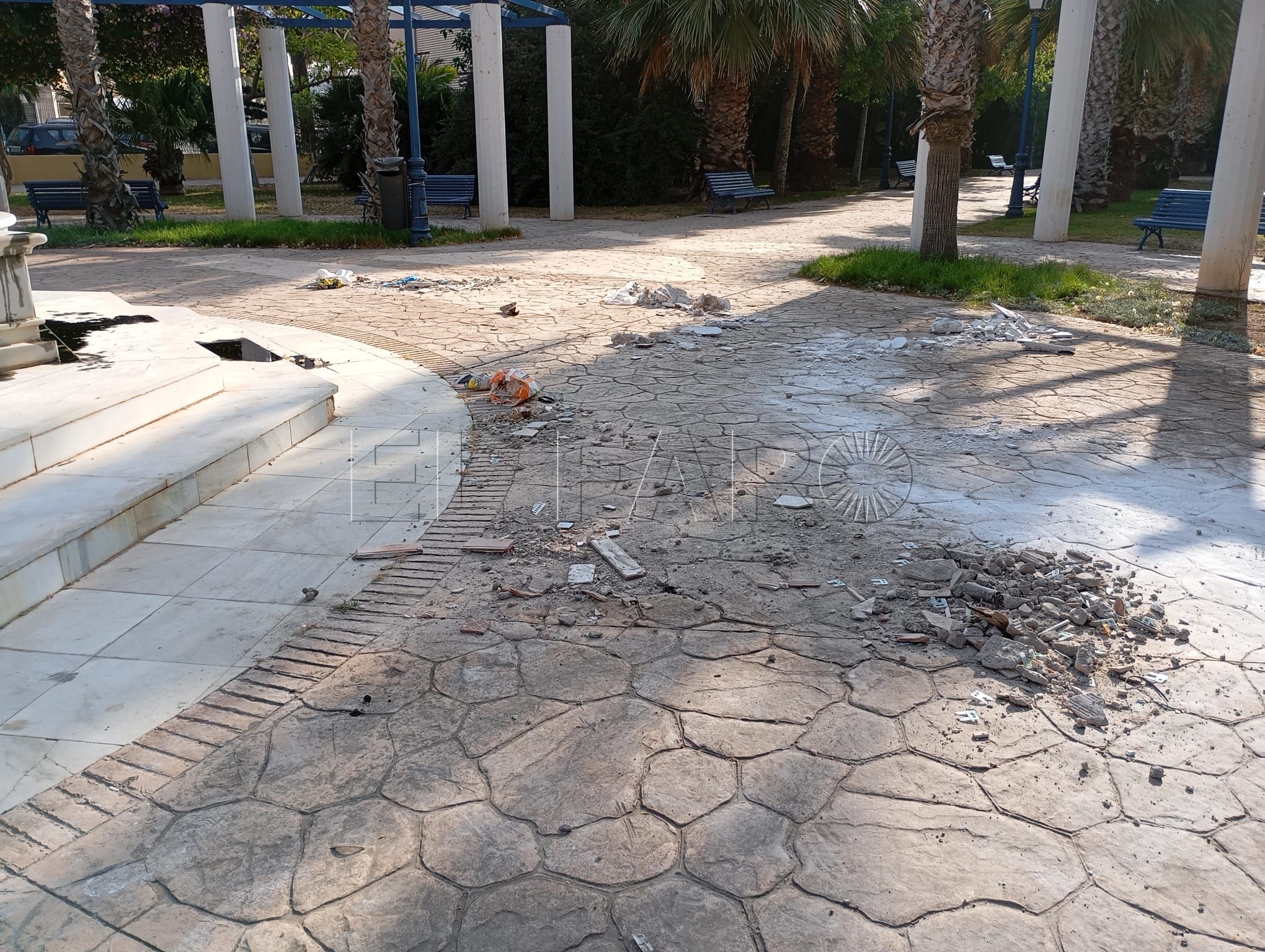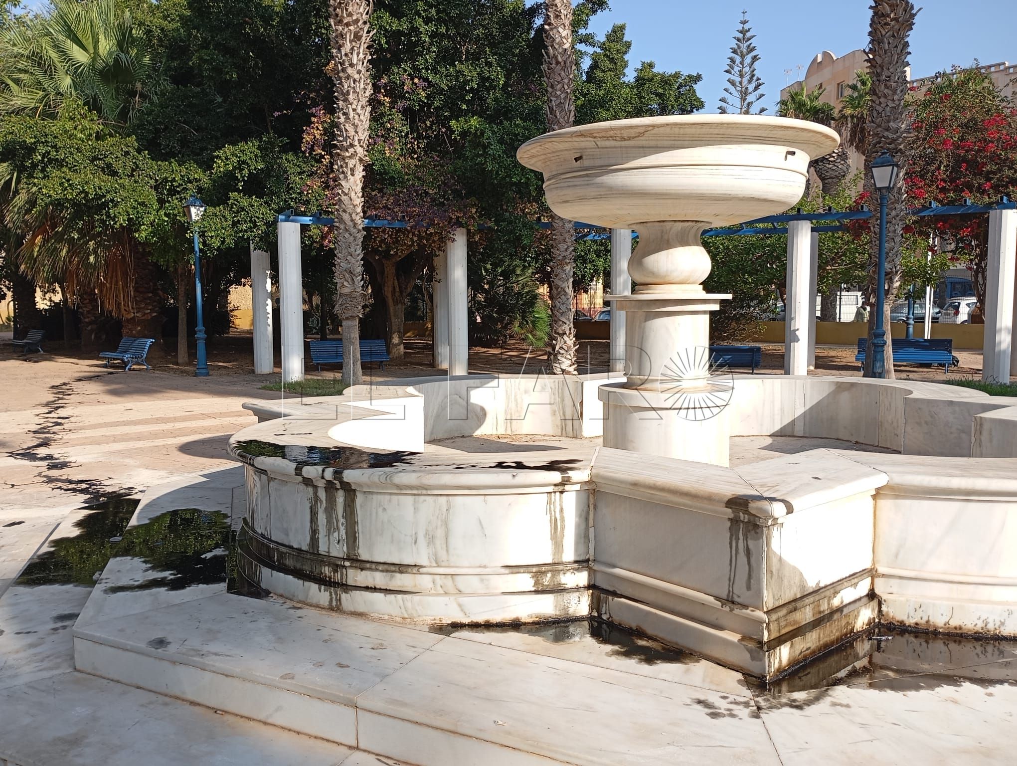 A las 9:30 de la mañana no hay nadie en el parque de Las Palmeras. Por no haber, ni siquiera hay puertas, que han sido arrancadas. Papeleras quedan cada vez menos, ya que dos, al menos, han sido también arrancadas y alguna otra luce desvencijada. Cascotes de piedra tirados, bolsas de material de construcción, aceite por el suelo que llega hasta los bancos e incluso mancha la fuente.