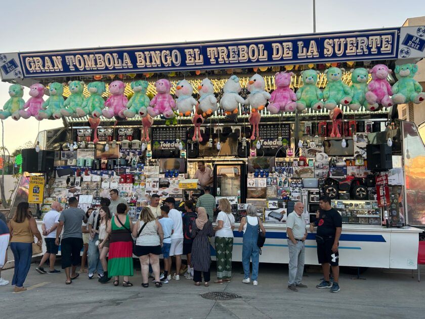 Pero la feria no solo alimenta el paladar. También alimenta la ilusión del azar. Y entonces, entre los focos de colores, aparece Pedro Alguacil, que lleva más de medio siglo entregado al bingo. A sus casi 81 años, cuenta que cambió la agricultura por las ferias y desde entonces ha recorrido España entera con sus rifas, ruletas y tómbolas. “Siempre me gustó un negocio limpio, en el que no se pueda hacer trampa”, asegura, mientras acaricia con la mirada la mesa repleta de premios: planchas, batidoras, televisores, peluches.