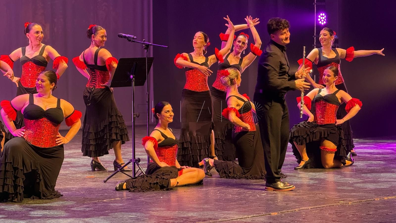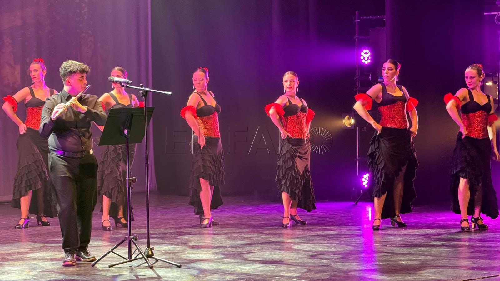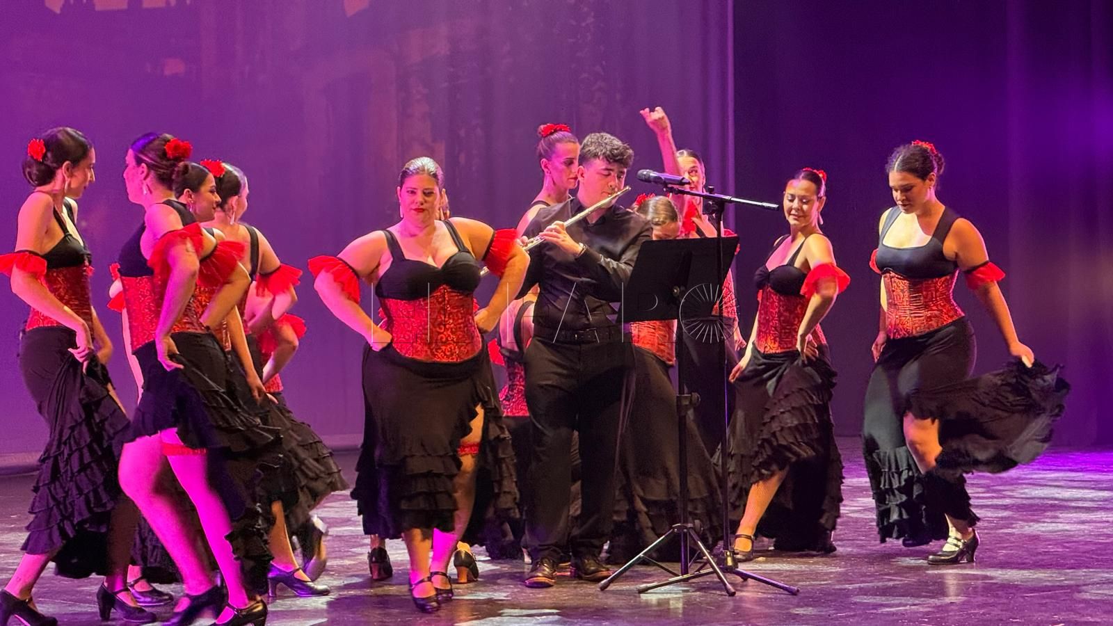 No se trataba únicamente de escuchar música —aunque esta estuvo presente incluso en directo, con la intervención de un joven flautista— ni de observar el movimiento. La velada se construyó como un espacio en el que ambas dimensiones se entrelazaban hasta hacerse inseparables. La música no acompañaba: sostenía. Era el lugar desde el que nacía el gesto, desde el que se organizaba el tiempo y desde el que cada pieza adquiría sentido. El taconeo marcaba el pulso, las castañuelas dibujaban el compás, las puntas resonaban sobre las tablas amplificando la caída del salto, mientras el vestuario —tutús, volantes, mantones— contribuía no solo a la estética, sino también a la narrativa sonora del conjunto.