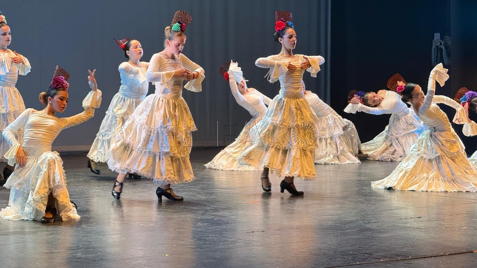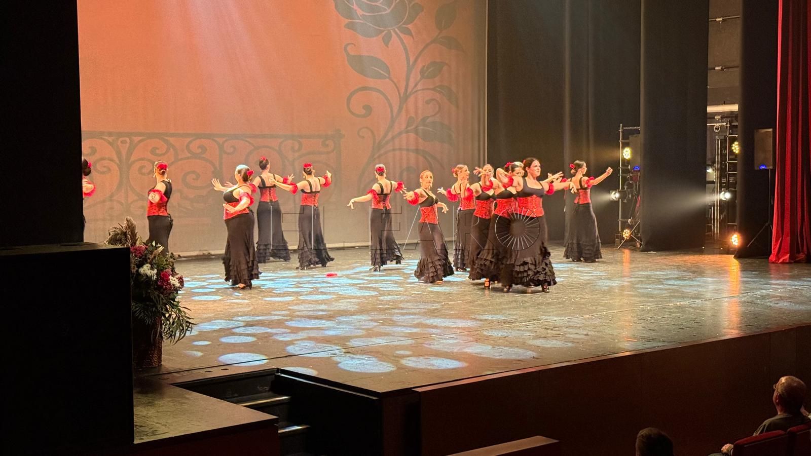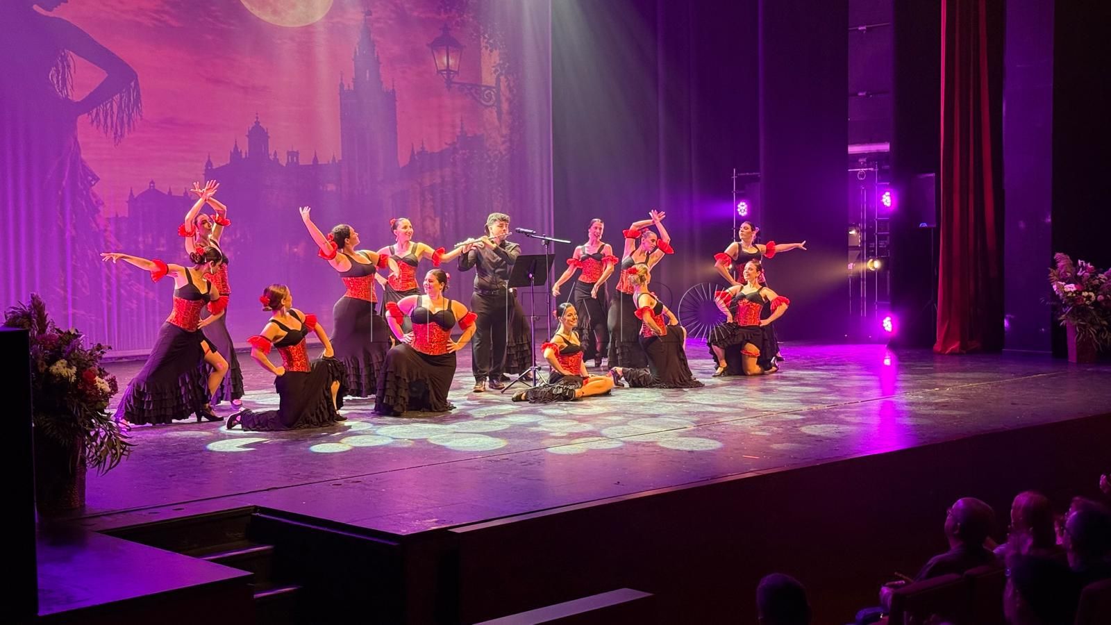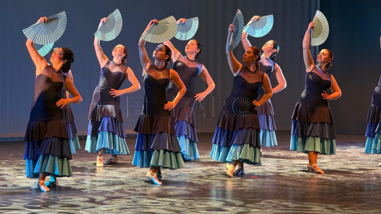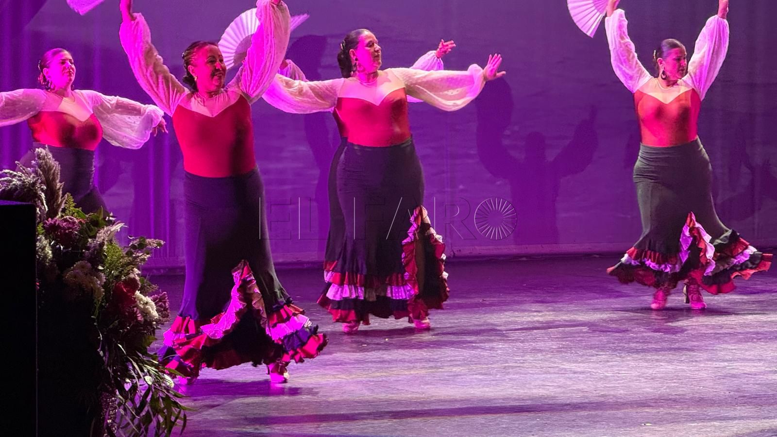El cambio hacia la danza española trajo consigo una transformación inmediata del paisaje sonoro. El taconeo irrumpió con fuerza, acompañado por el ritmo seco de las castañuelas. Seis bailarinas, envueltas en mantones y con rosas como elemento escénico, desplegaron una coreografía donde los giros y las figuras parecían sostener una tensión entre lo clásico y lo flamenco. El público respondió con aplausos y “olés”, integrándose en ese mismo compás.