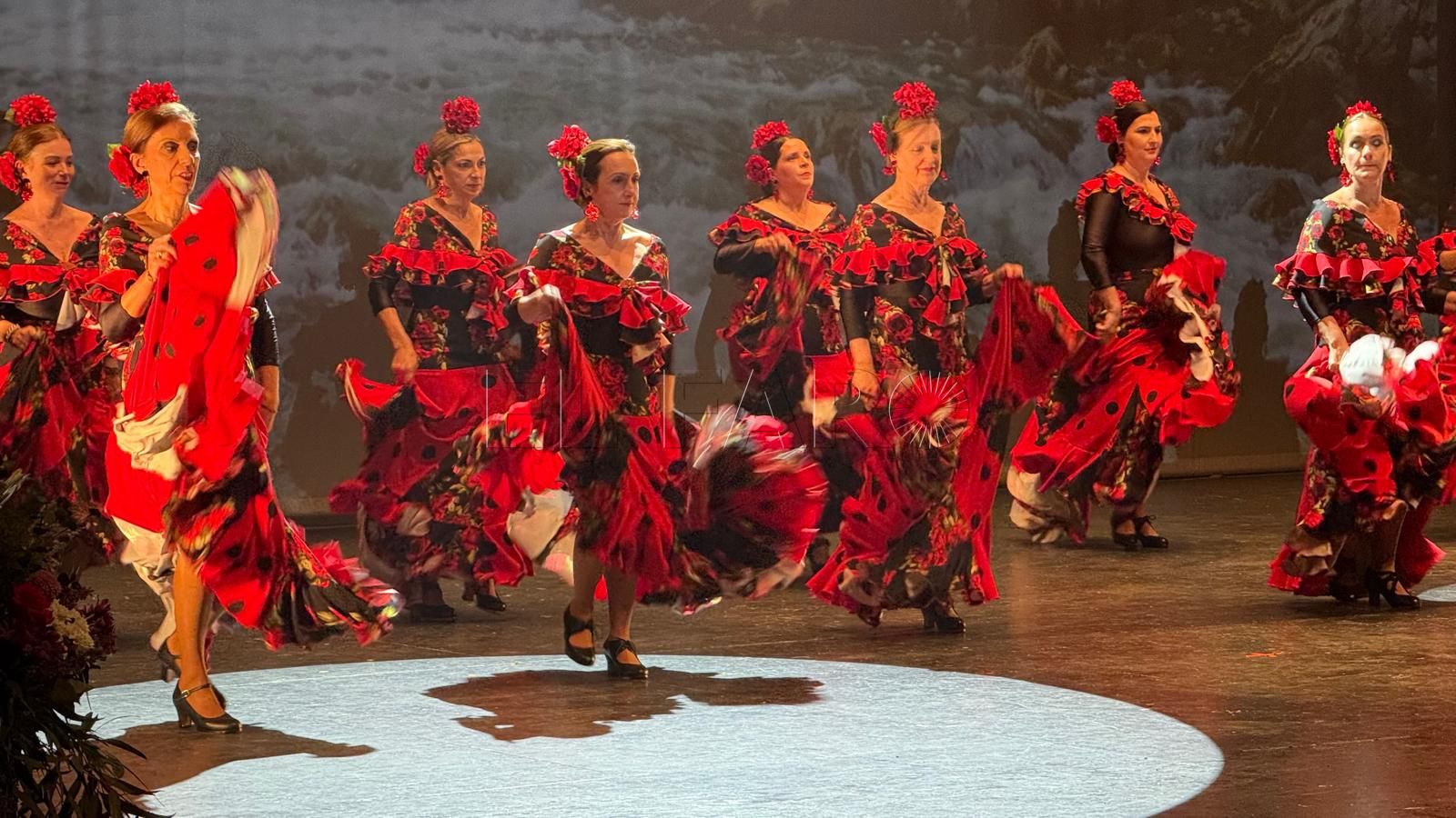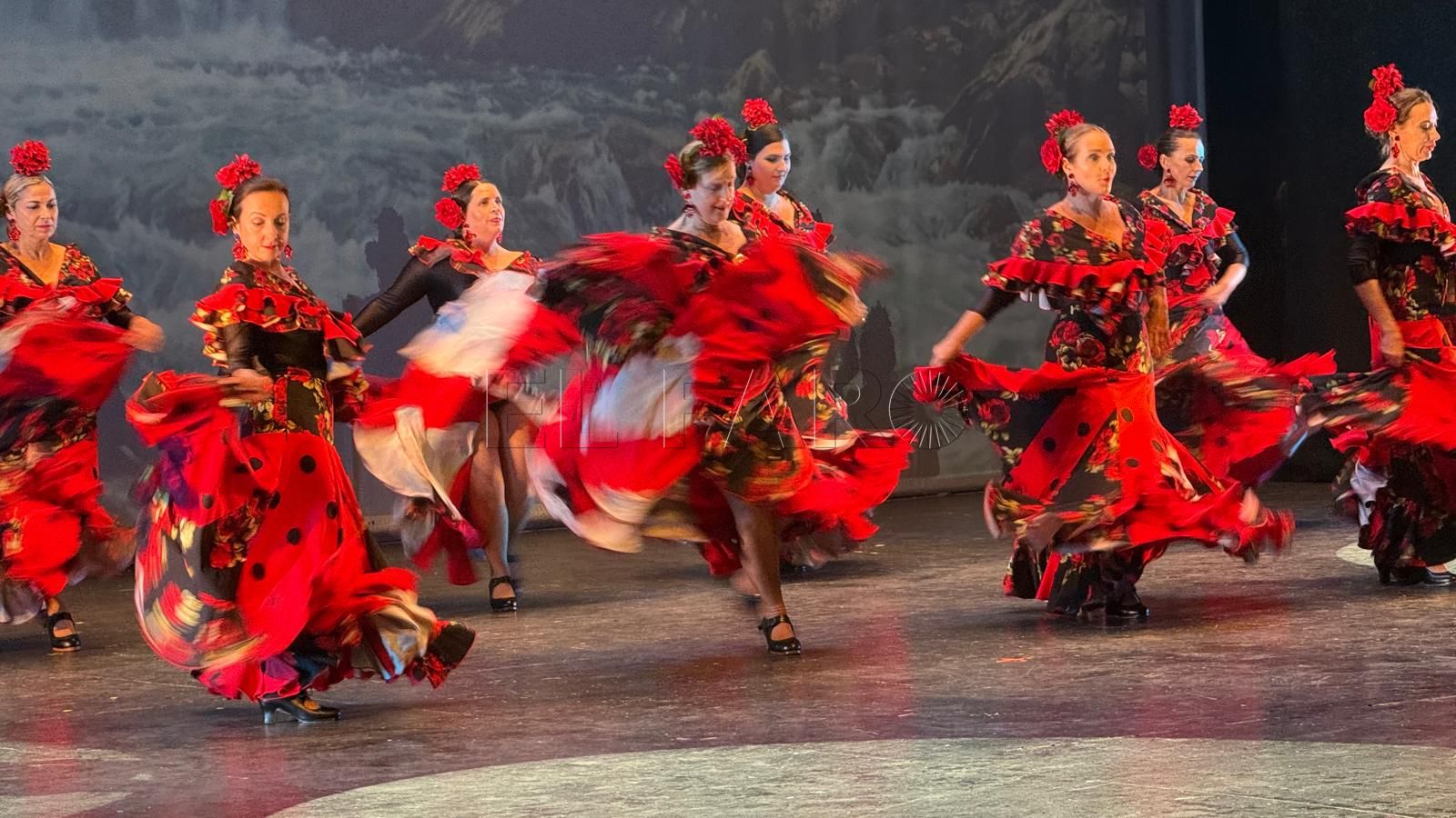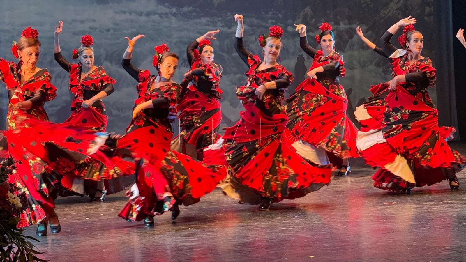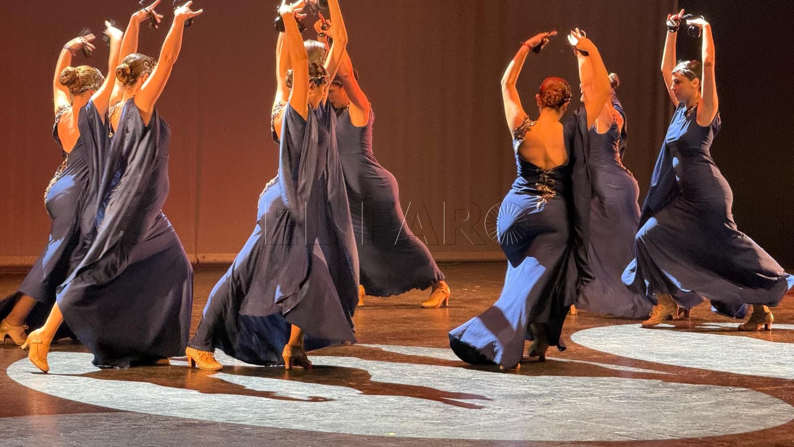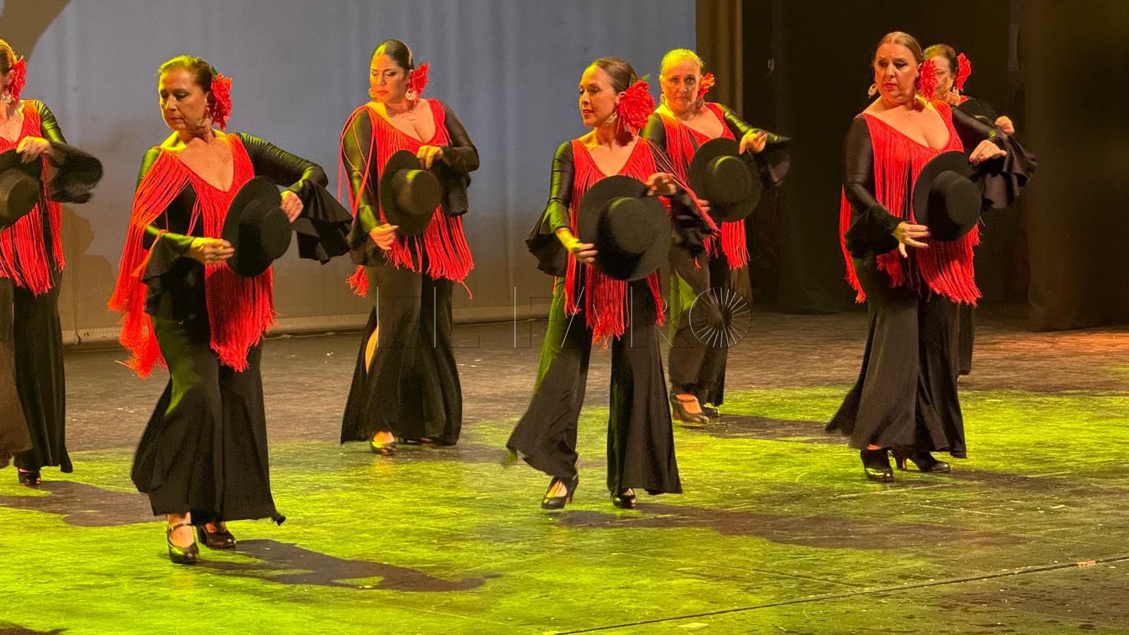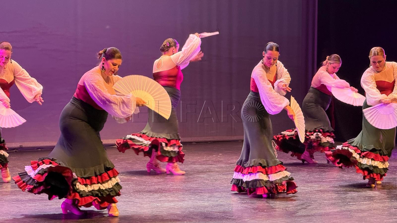 El cambio hacia la danza española trajo consigo una transformación inmediata del paisaje sonoro. El taconeo irrumpió con fuerza, acompañado por el ritmo seco de las castañuelas. Seis bailarinas, envueltas en mantones y con rosas como elemento escénico, desplegaron una coreografía donde los giros y las figuras parecían sostener una tensión entre lo clásico y lo flamenco. El público respondió con aplausos y “olés”, integrándose en ese mismo compás.