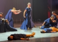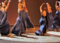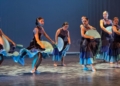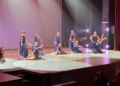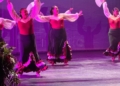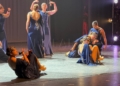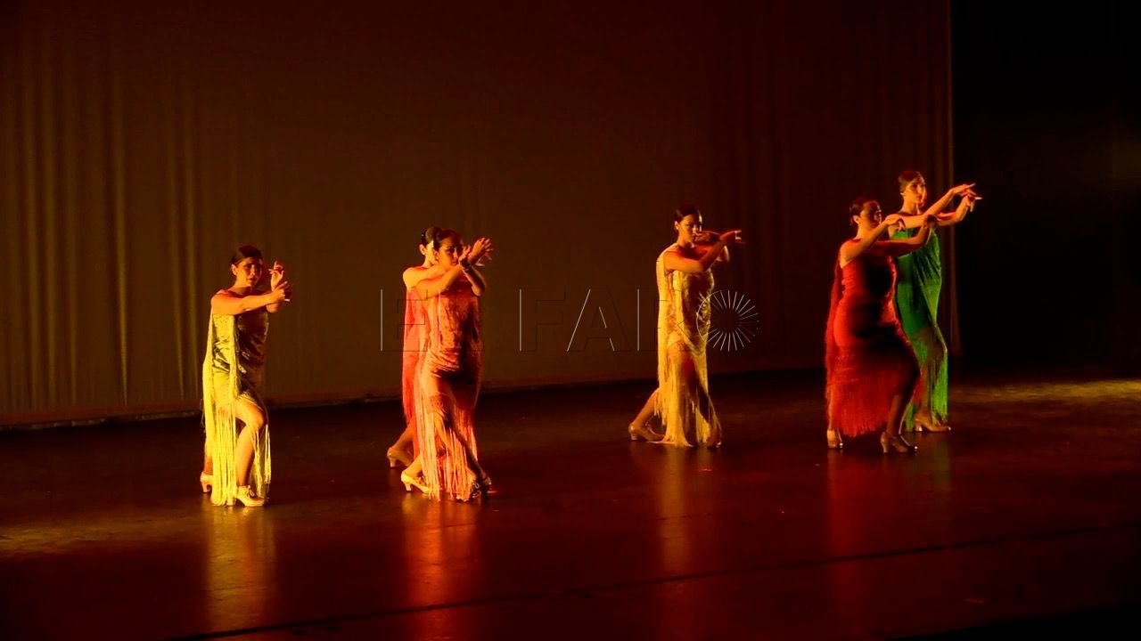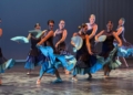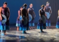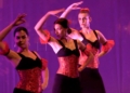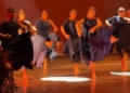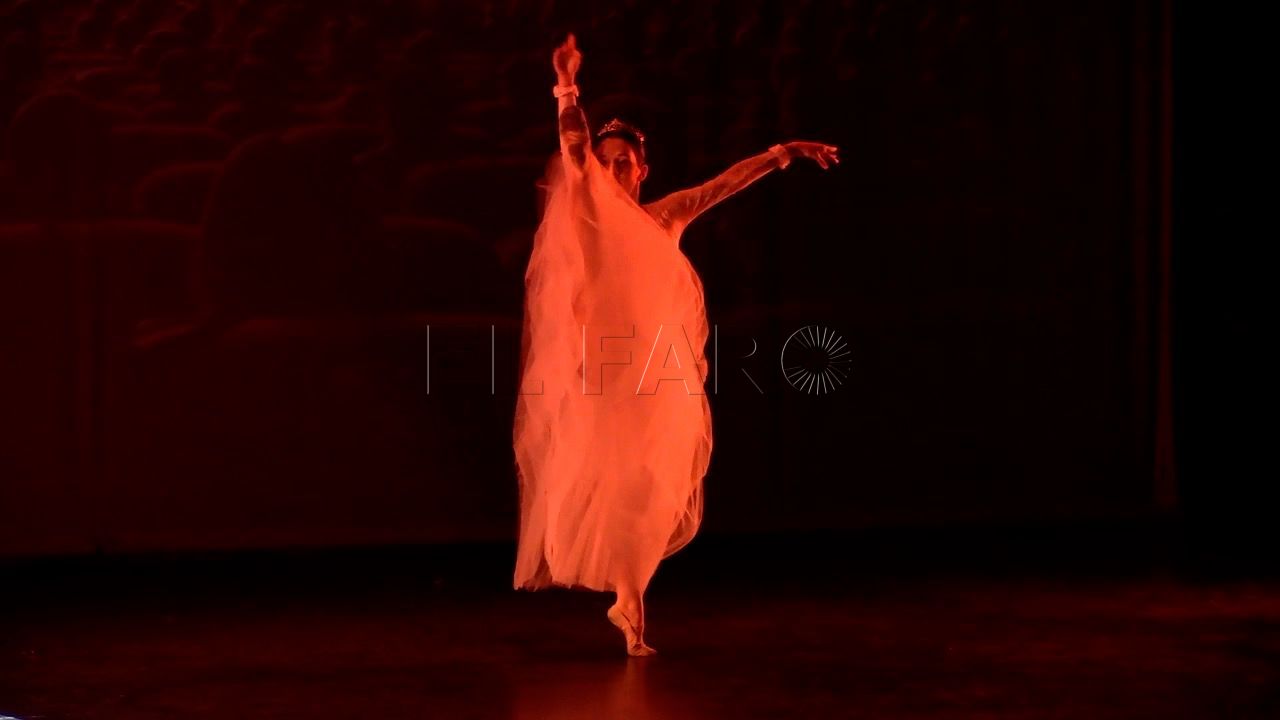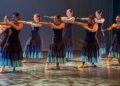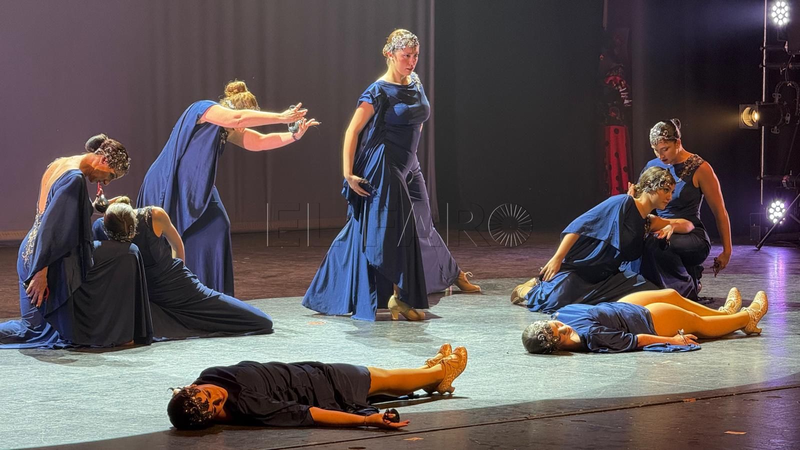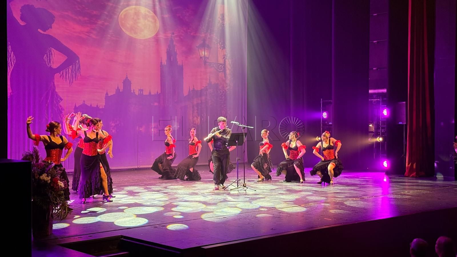 La Habanera introdujo uno de los momentos más singulares de la noche. En un escenario parcialmente en penumbra, con un altillo y un micrófono como elementos de transición, un joven flautista se situó en el centro para interpretar con flauta travesera. Su sonido, limpio y sostenido, se elevaba mientras la base grabada completaba la atmósfera. A su alrededor, las bailarinas —siete primero, seis después— construían una coreografía que envolvía la música, que la hacía visible a través del movimiento. La relación entre ambos lenguajes se volvía aquí especialmente evidente: la melodía guiaba, pero eran los cuerpos los que la expandían en el espacio.