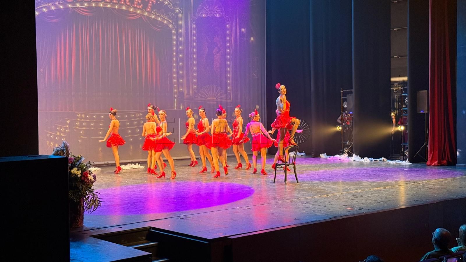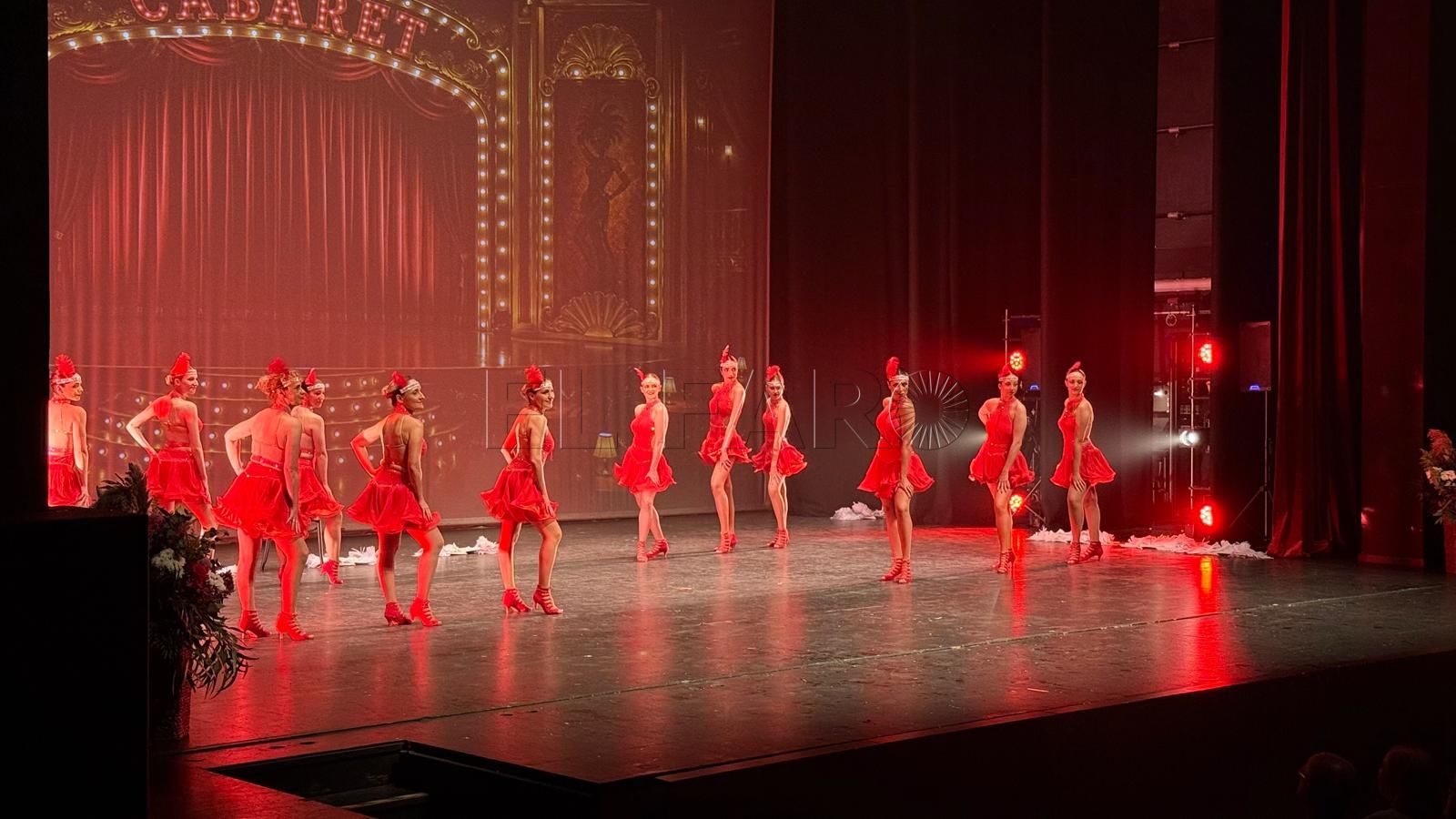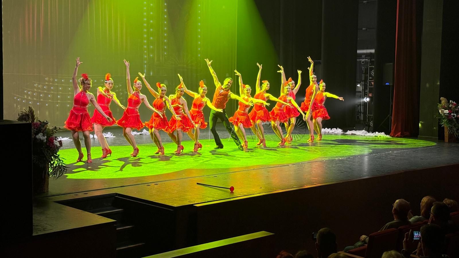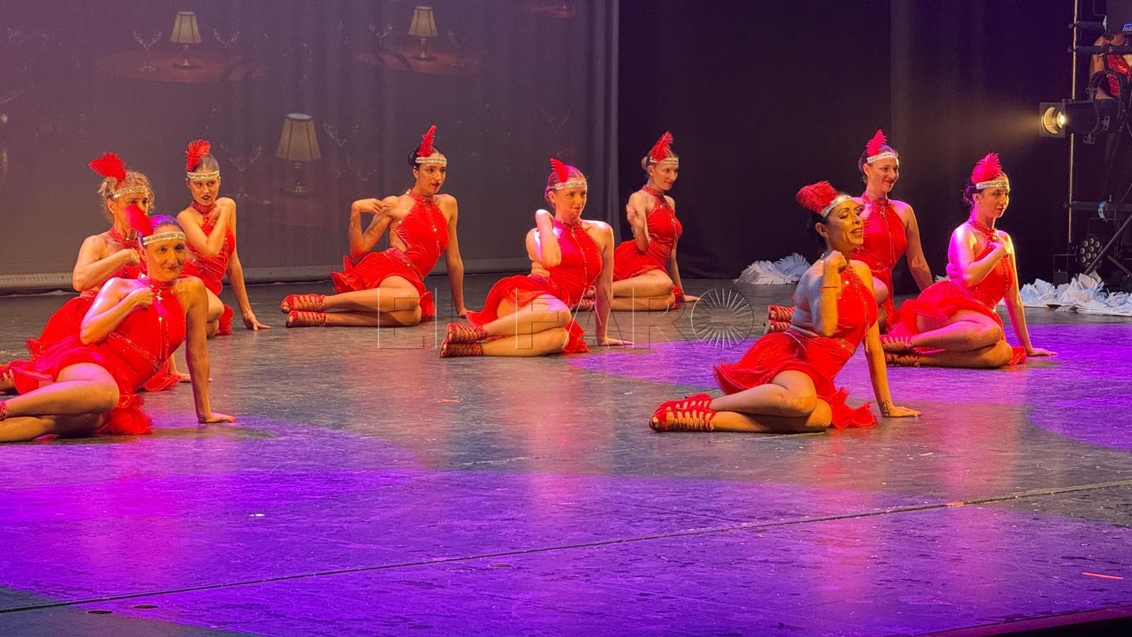 El paso al cabaret, bajo la coreografía de Nuria Nieto, supuso una ruptura estética y sonora. El rojo, los brillos y las plumas invadieron el escenario, acompañados por una música en playback que evocaba los grandes musicales. Doce bailarinas y un bailarín articularon una historia donde danza, interpretación y ritmo escénico se entrelazaban en una propuesta de carácter teatral.