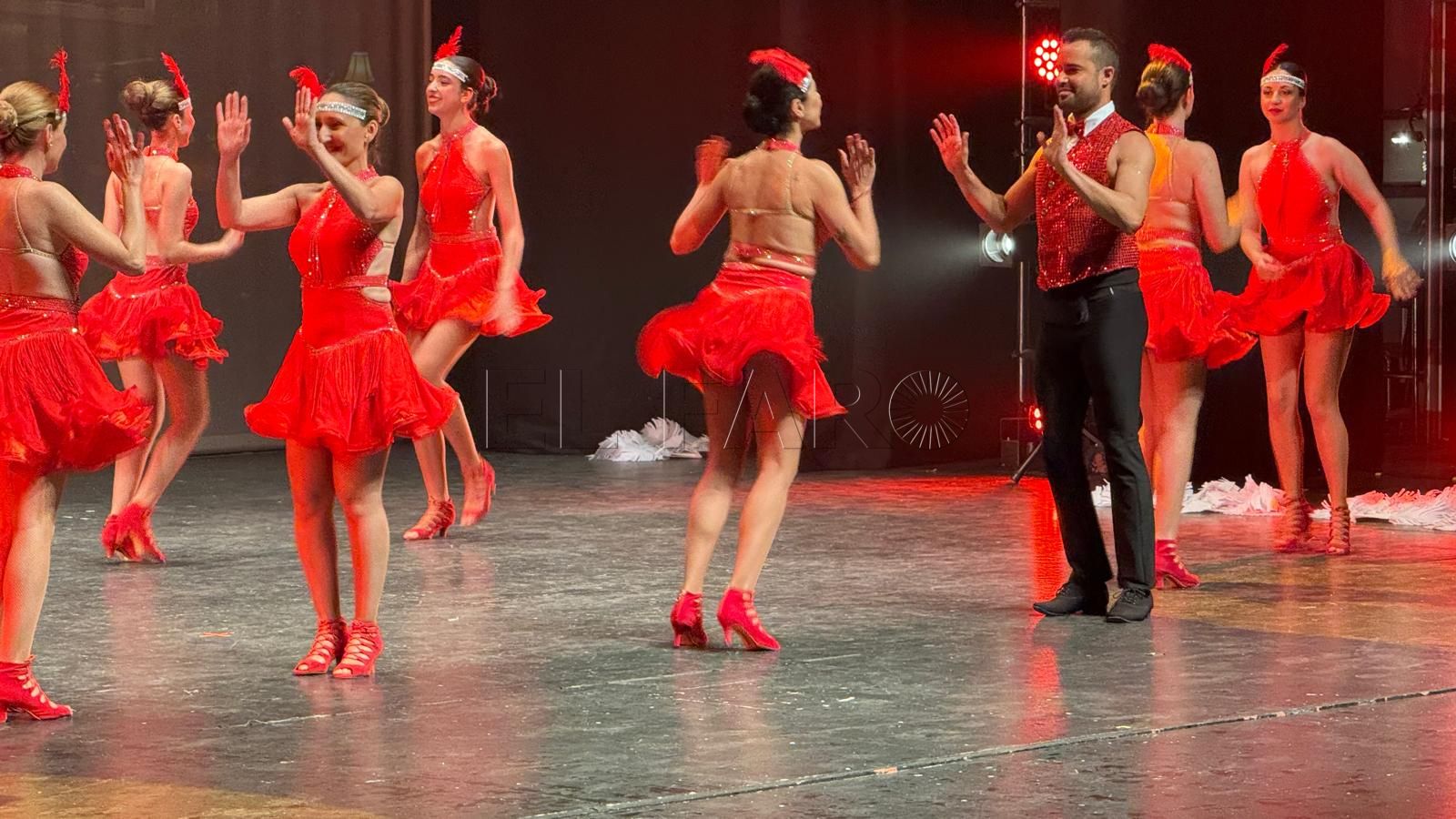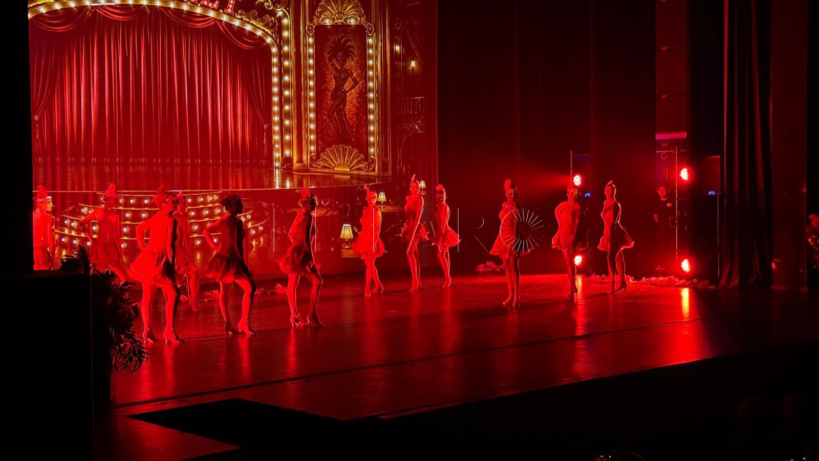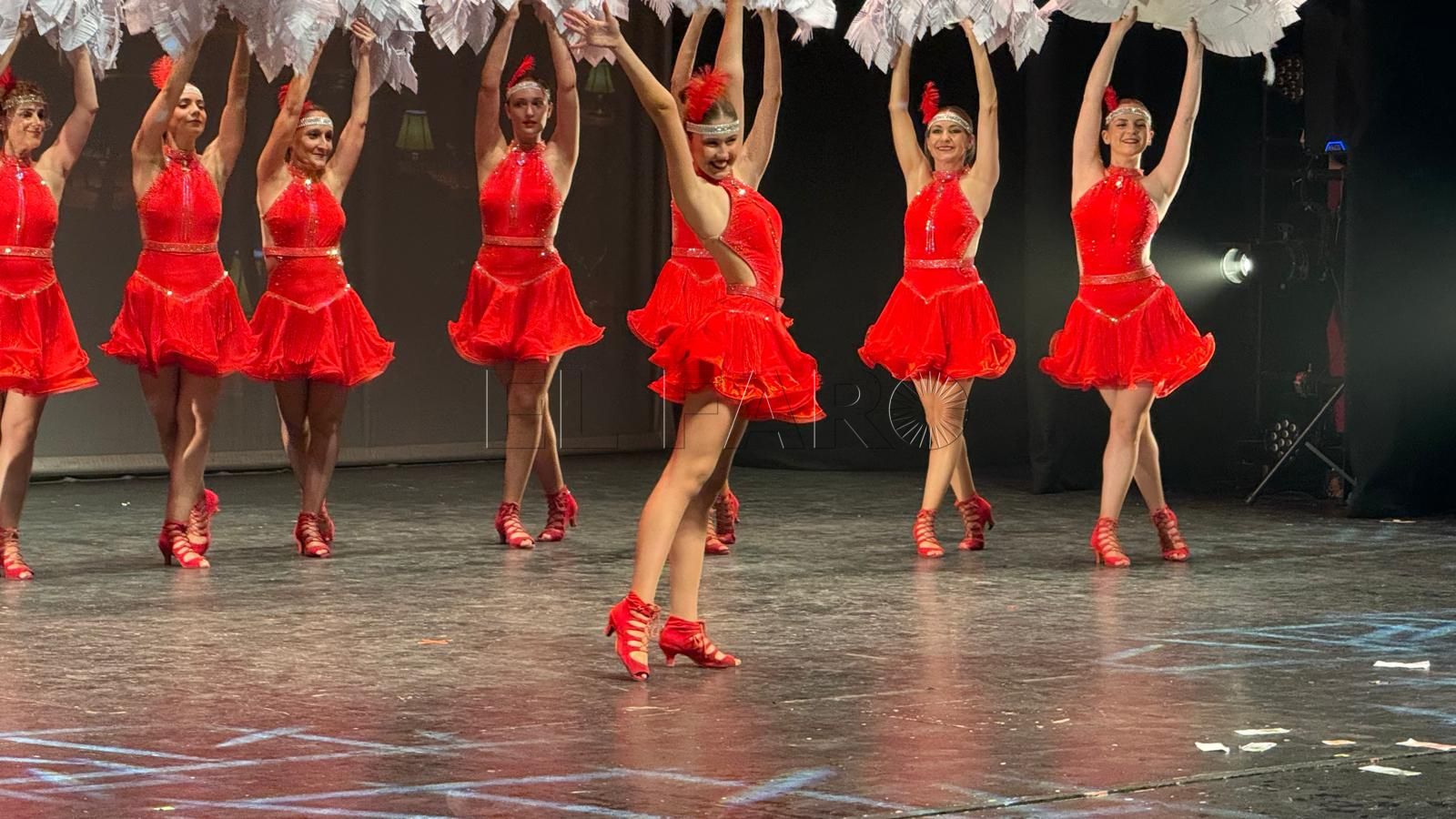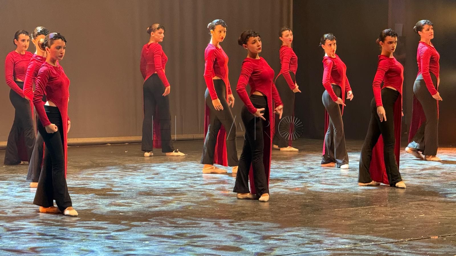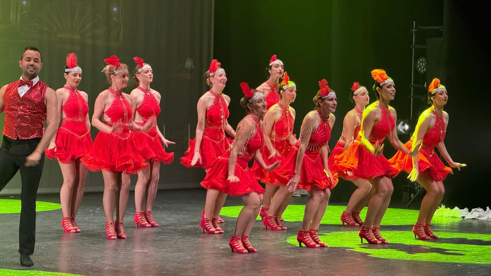 El paso al cabaret, bajo la coreografía de Nuria Nieto, supuso una ruptura estética y sonora. El rojo, los brillos y las plumas invadieron el escenario, acompañados por una música en playback que evocaba los grandes musicales. Doce bailarinas y un bailarín articularon una historia donde danza, interpretación y ritmo escénico se entrelazaban en una propuesta de carácter teatral.