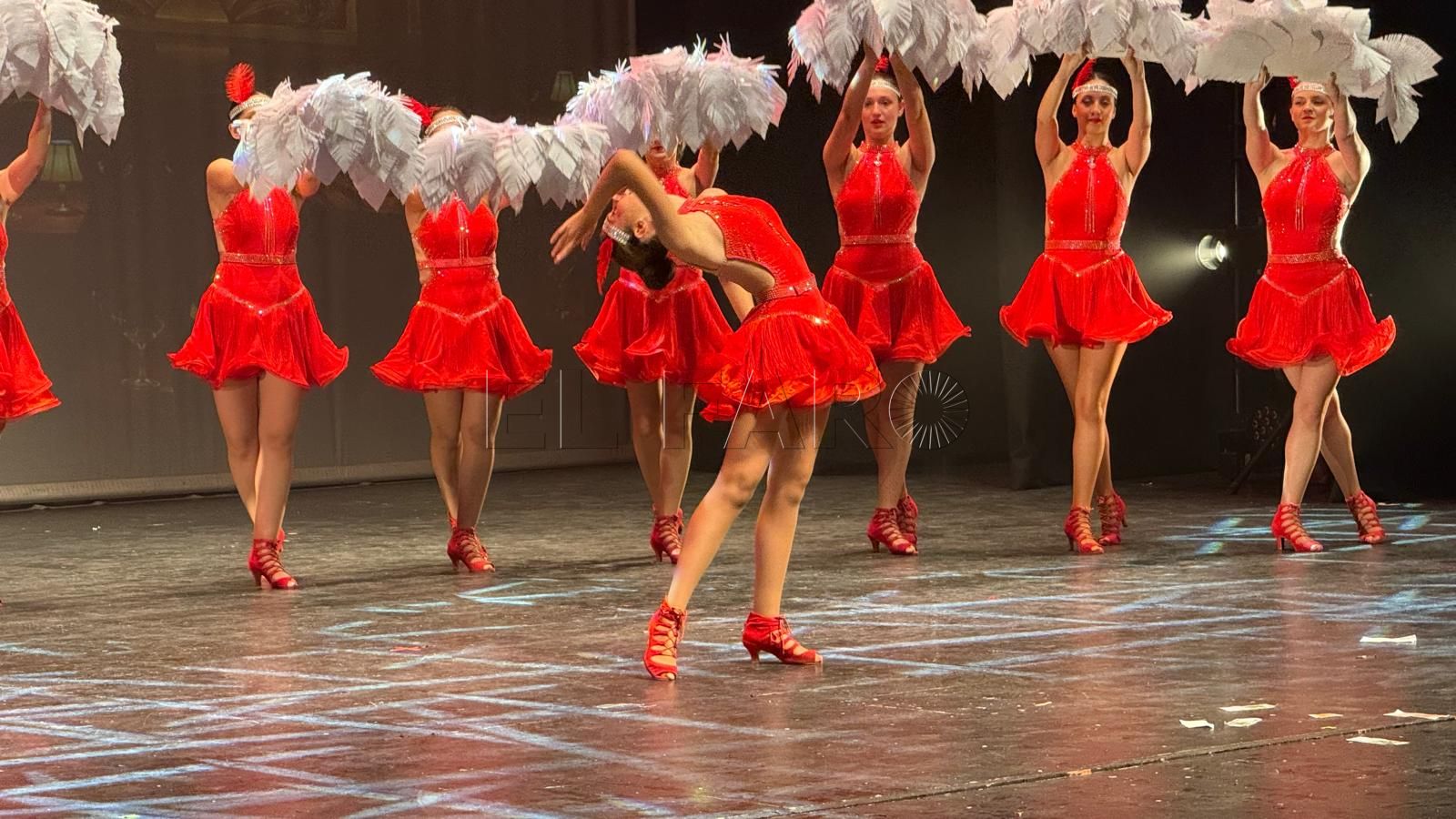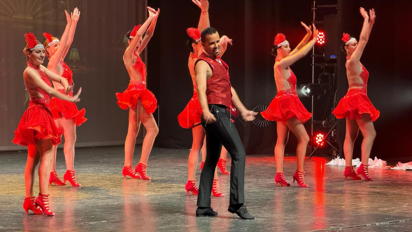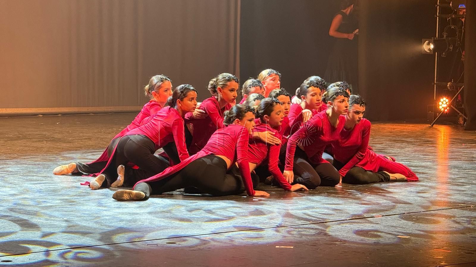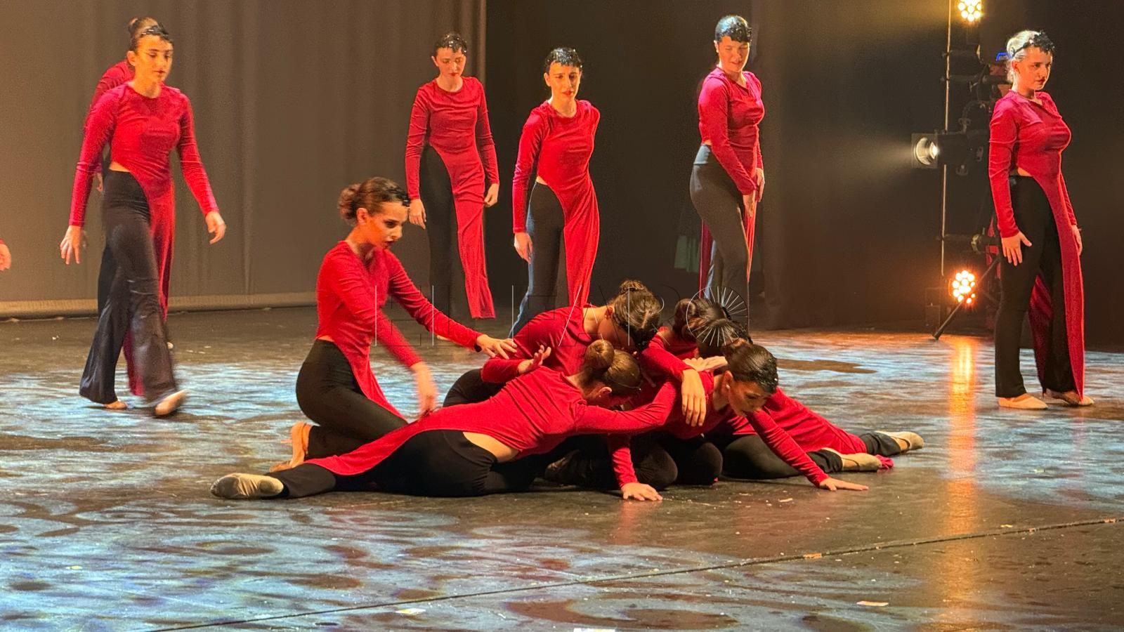 El paso al cabaret, bajo la coreografía de Nuria Nieto, supuso una ruptura estética y sonora. El rojo, los brillos y las plumas invadieron el escenario, acompañados por una música en playback que evocaba los grandes musicales. Doce bailarinas y un bailarín articularon una historia donde danza, interpretación y ritmo escénico se entrelazaban en una propuesta de carácter teatral.