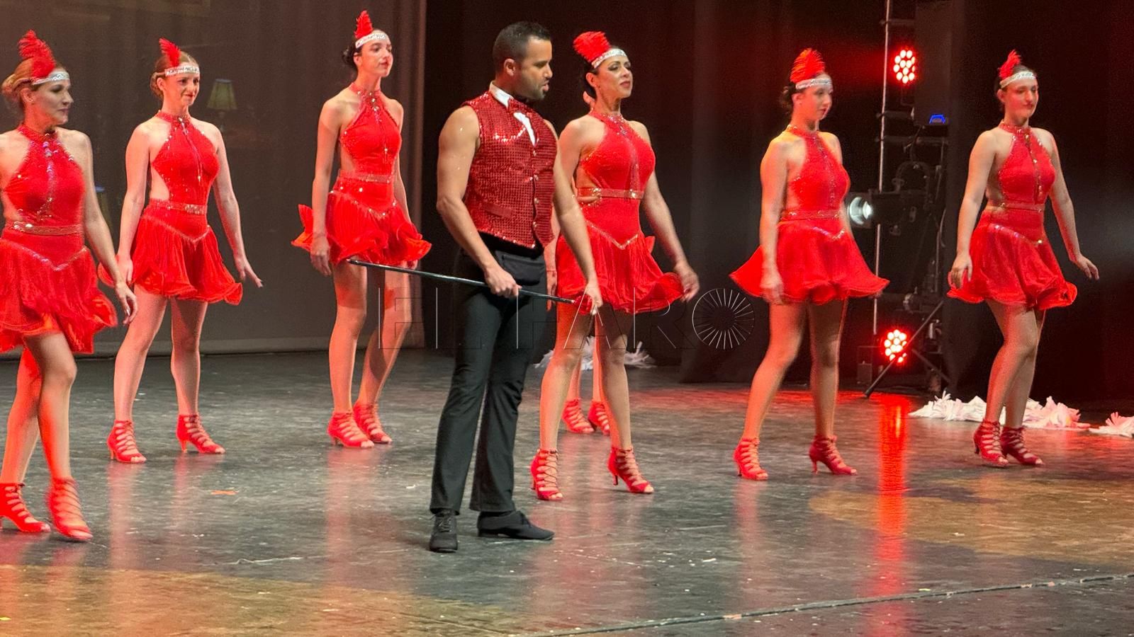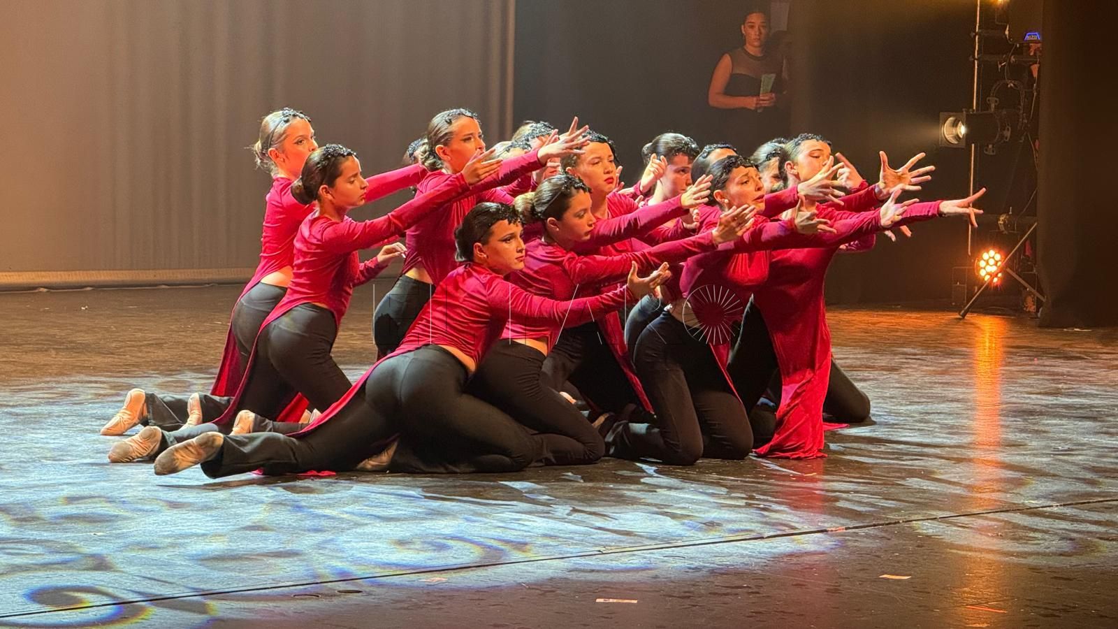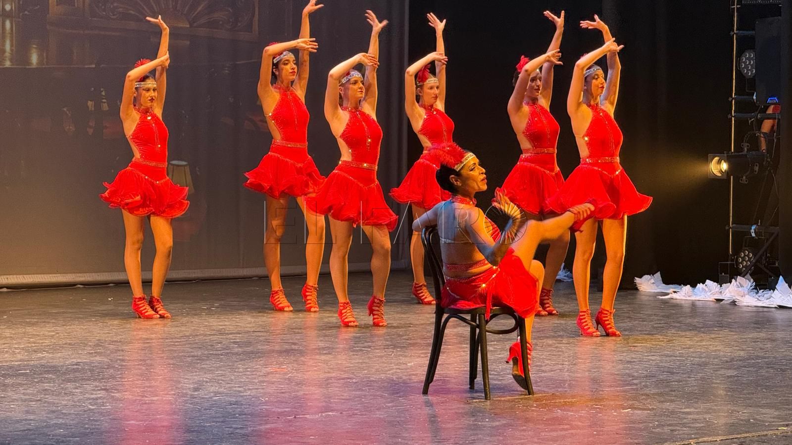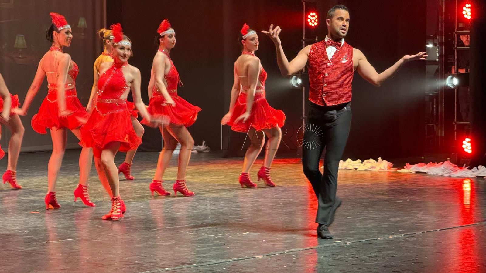 El paso al cabaret, bajo la coreografía de Nuria Nieto, supuso una ruptura estética y sonora. El rojo, los brillos y las plumas invadieron el escenario, acompañados por una música en playback que evocaba los grandes musicales. Doce bailarinas y un bailarín articularon una historia donde danza, interpretación y ritmo escénico se entrelazaban en una propuesta de carácter teatral.
