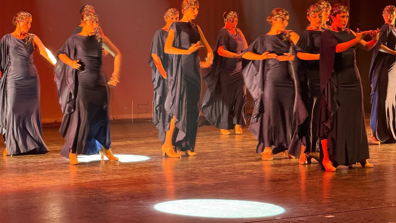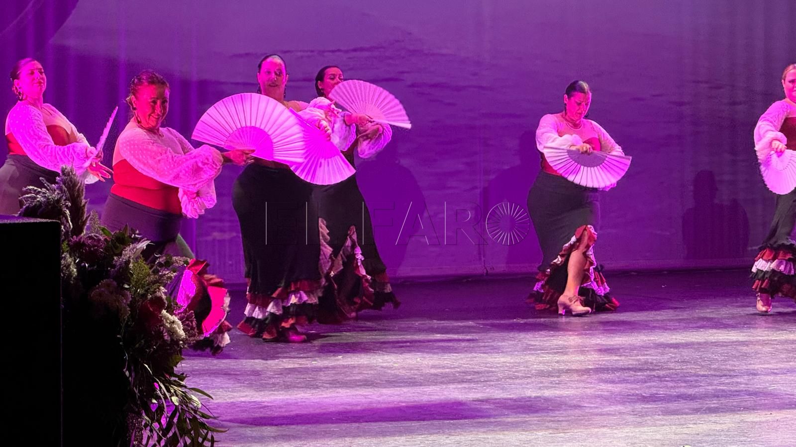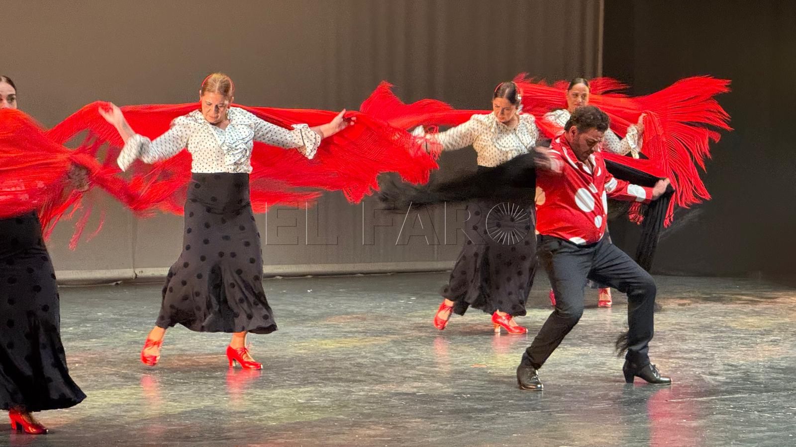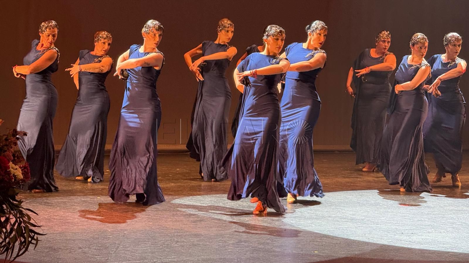 La segunda parte del espectáculo mantuvo la diversidad de propuestas. ‘Vivaldi’, de Mari Carmen Florido, mostró cómo la música clásica podía tensar y ordenar el movimiento, mientras el abanico añadía un matiz sonoro propio. Las sevillanas con mantón, de Gonzalo Carmona, centraron la atención en el vuelo de esta prenda, cuyo movimiento generaba un diálogo constante con el ritmo.