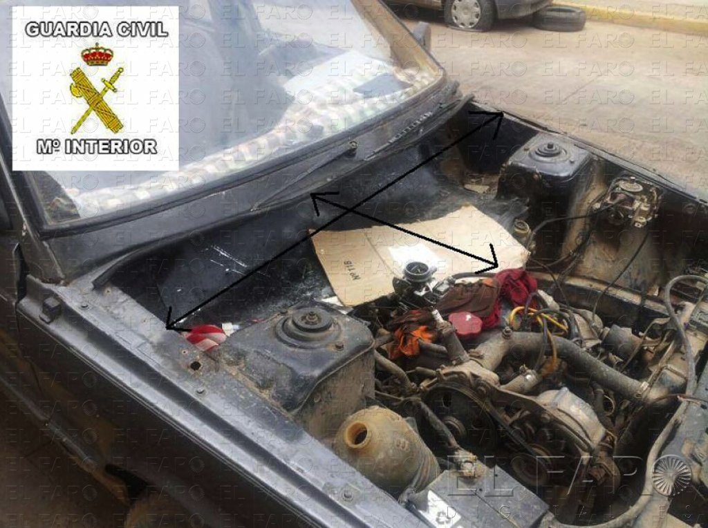 Una vez detenidos, se inició el reconocimiento del vehículo, localizando dos dobles fondos, uno en el compartimiento del motor y otro tras el asiento trasero, donde se hallaron dos personas que tuvieron que ser auxiliadas para salir de los habitáculos “infrahumanos”.
