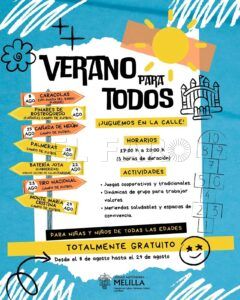 Con el lema '¡Juguemos en la calle!', la Ciudad Autónoma de Melilla, a través de la Consejería de Cultura, Patrimonio Cultural y del Mayor, ha lanzado una atractiva iniciativa de verano dirigida a los más pequeños de la casa. La propuesta, bajo el nombre 'Verano para todos', llevará a cabo jornadas lúdicas y de convivencia en distintos barrios de la ciudad del 8 al 29 de agosto, ofreciendo actividades gratuitas para niñas y niños de todas las edades.