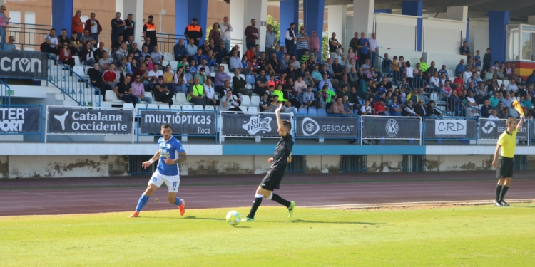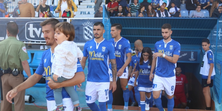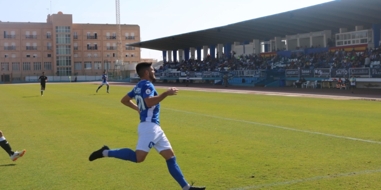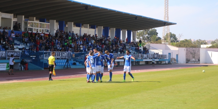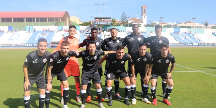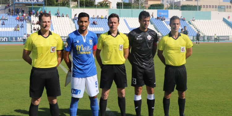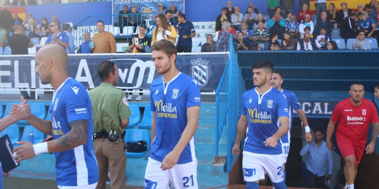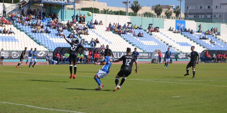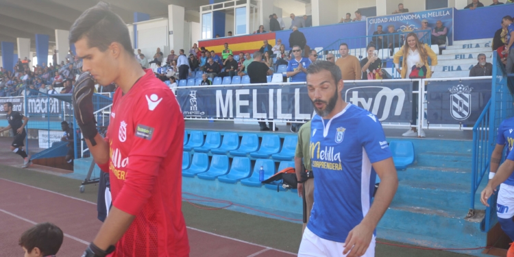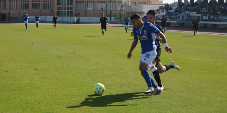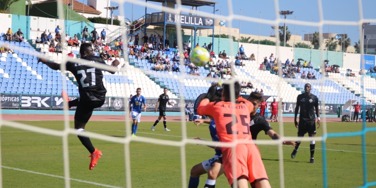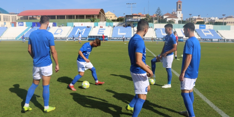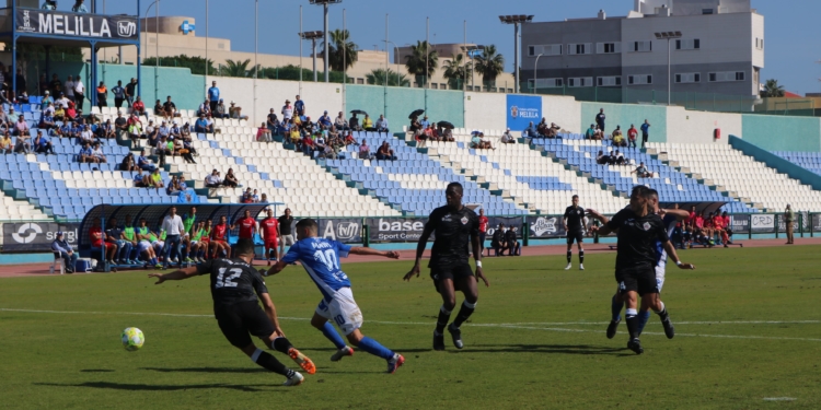 La primera mitad resultó anodina. Tras unos primeros minutos de dominio azulino en los que los anfitriones tuvieron un par de ocasiones claras para tomar ventaja en el marcador el juego se equilibró. Al dominio infructuoso de ambos equipos se unió las incontables imprecisiones a la hora de enlazar tres pases seguidos por una y otra parte. Hubo que esperar hasta el primer cuarto de hora para ver la primera ocasión del partido y esta llegaba en las botas de un jugador visitante. Fer Ruiz protagonizaba una internada por la banda derecha y centraba pasado al segundo palo donde aparecía Pipe Sáez para conectar un zurdazo que se marchaba fuera rozando la base del palo derecho del portal de la escuadra melillense.