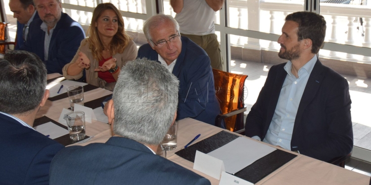 El presidente del PP nacional, Pablo Casado, se ha reunido esta mañana con la dirección del PP de Melilla en la dársena pesquera y también ha aprovechado para mantener un encuentro con un nutrido grupo de empresarios de la ciudad, liderados por la Confederación de Empresarios de Melilla (CEME).