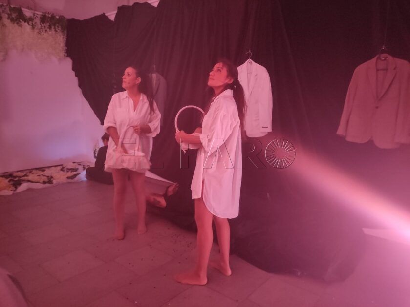 Sobre ese suelo compartido, la poesía tomó cuerpo en forma de guión. Un texto tejido con testimonios, con cicatrices, con silencios que pesan más que los gritos. En escena, dos mujeres y un niño vestidos de blanco. Frente a ellos, un hombre de negro. No necesita palabras: su sola presencia basta para oprimir, aislar, marcar cada gesto, cada decisión, cada avance de las protagonistas. Él está sin estar. Es sombra que domina, que impide, que vigila, que acompaña.
