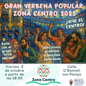 La gran verbena contará con el desarrollo de juegos populares, baile, animación, concursos así como varios puestos de venta. Asimismo, los melillenses podrán disfrutar de la actuación del grupo local, Cita Previa.