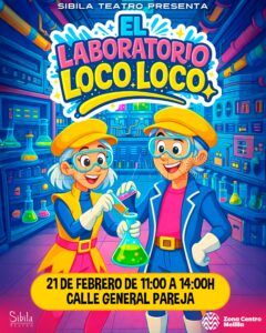 El sábado 21 en horario de 11.00 a 14.00 horas en la calle General Pareja se desarrollará un taller infantil junto a Sibila Teatro. Niños y niñas podrán explorar en el ámbito de la ciencia de la mano de animadores profesionales. Con pintacaras y un carné de Científico Loco Loco que ellos mismos fabricarán, experimentarán con materiales en un entorno creativo y controlado.