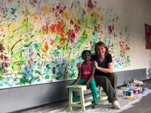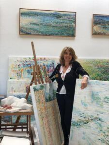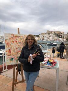 Lejos de representar escenas de forma literal, la artista opta por un lenguaje que mezcla lo figurativo con lo abstracto, lo poético con lo plástico. En sus lienzos hay mujeres, sí, pero no como retratos definidos, sino como presencias intuidas, como siluetas en movimiento, como destellos que emergen del color. “Pinto de pie, moviéndome. Es como una danza. El gesto no está acabado, la pincelada queda viva. Me gusta sugerir más que contar”, afirma. Esa gestualidad, ese movimiento corporal, atraviesa toda su obra: cada trazo nace del cuerpo, no solo de la mano; cada textura cuenta con la colaboración del azar, de la materia, de lo que fluye.