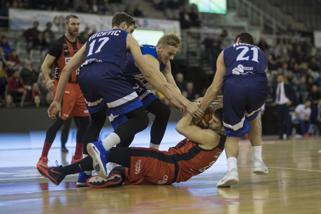El pívot lituano trata de arrebatar el balón a un jugador del Covirán Granada ayudado por Vucetic y Juan Rubio.